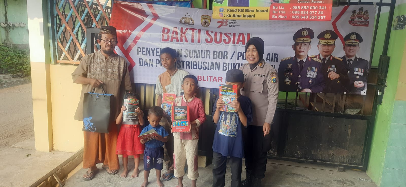 Selain baksos pemberian sumur bor dan pompa air, Polres Blitar Kota juga memberikan buku bacaan sebanyak 50 buku bacaan di Ponpes Ibadurrahman Ngegong Sananwetan Kota Blitar.
