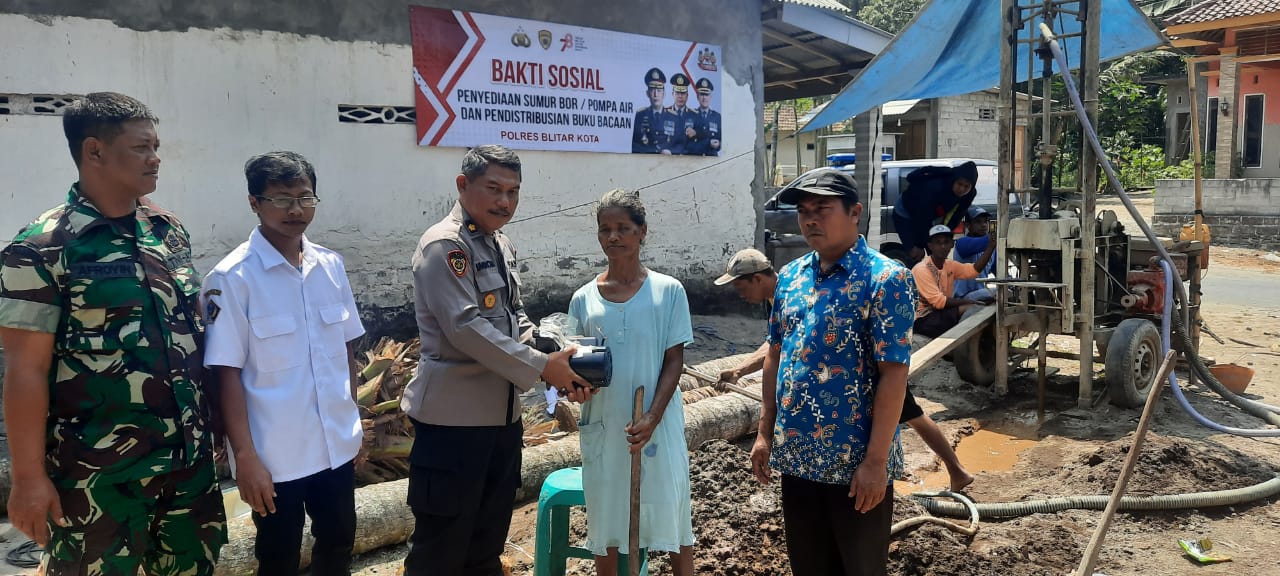 Dalam upaya memenuhi kebutuhan mendasar, Polres Blitar Kota menyerahkan bantuan pembuatan sumur bor dan pemasangan pompa air kepada Yuliani(47) Dusun Karangbendo Rt 03 Rw 07 Kecamatan Ponggok Kabupaten Blitar.