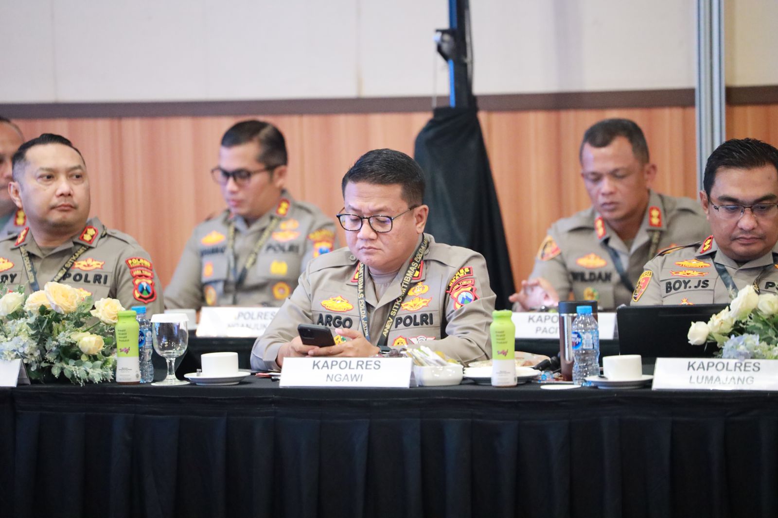 Kapolres Ngawi AKBP Argowiyono, S.H., S.I.K., M.Si., di aula hotel Aston Jln. MH Tamrin 10 Bojonegoro, dalam kegiatan anev Sitkamtibmas Polda Jatim.