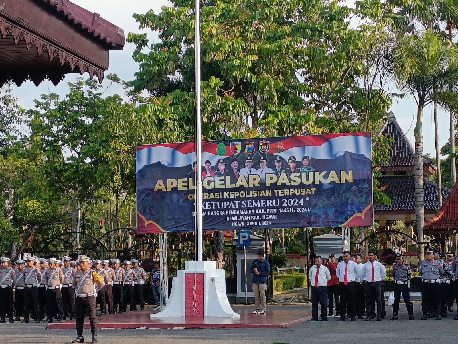 Bupati Ngawi H Ony Anwar Harsono, S.T., M.T., didampingi Kapolres Ngawi AKBP Argowiyono, S.H., S.I.K., M.Si dan Dandim 0805 Ngawi Letkol Arm Didik Kurniawan, SIP., memimpin Apel Gelar Pasukan Operasi Ketupat Tahun 2024 di halaman pendopo Wedya Graha Kabupaten Ngawi, pada Rabu (3/4/2024)