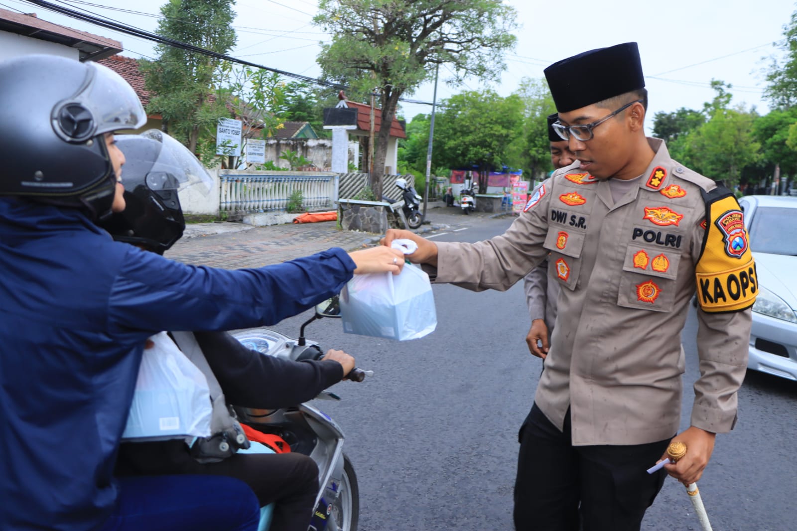 “Hati-hati di jalan raya, bila ada hal yang mencurigakan, segera lapor polisi atau telpon saja 110. Jangan takut ya, selamat berbuka puasa,” ucap Kapolres Ngawi saat memberikan takjil ke warga.