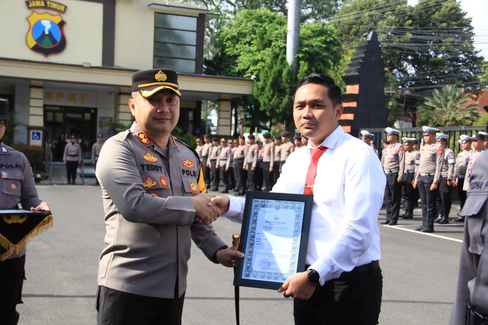 Dalam sambutanya AKBP Teddy mengatakan bahwa penghargaan ini merupakan apreseasi kepada personel Satreskrim Polres Kediri Kota atas upaya dan kerja keras berhasil menangkap pelaku pengeroyakan yang menjadi atensi dan perhatian seluruh warga Kota kediri
