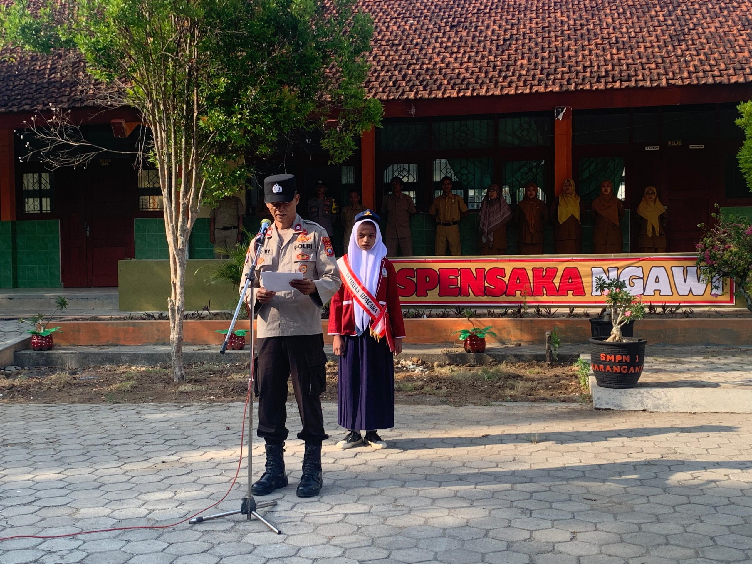 Dalam rangka program Police Go To School, Kanit Binmas Polsek Karanganyar Aiptu Topo bertindak sebagai Pembina Upacara Bendera di SMPN 1 Karanganyar, Senin (29/09/2025).