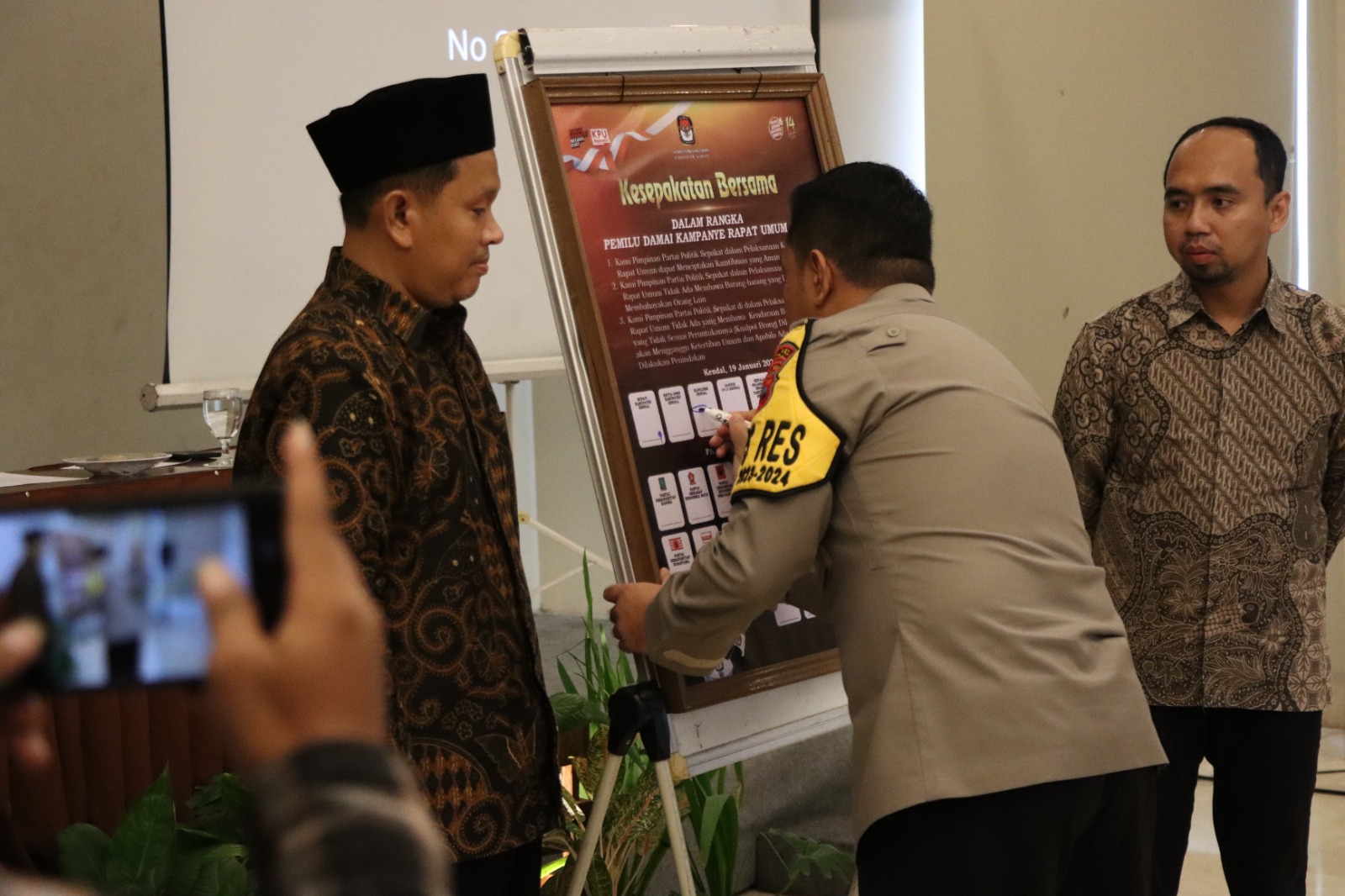 Acara penandatanganan ini diawali oleh Sekretaris Daerah (Sekda) Kendal, Kepala Kepolisian Resort (Kapolres) Kendal, Dandim 0715 Kendal, Pelaksana Harian (Plh) Komisi Pemilihan Umum (KPU) Kendal, dan Ketua Badan Pengawas Pemilu (Bawaslu) Kendal. Kesepakatan tersebut diambil guna menjaga ketertiban, keamanan, dan kedamaian dalam pelaksanaan Pemilu di Kabupaten Kendal.