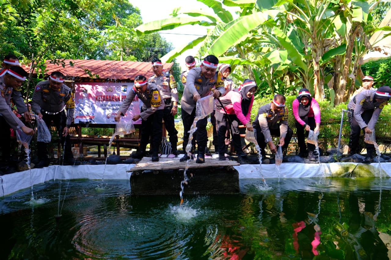 Dalam rangka menyemarakkan Hari Bhayangkara ke-78 tahun 2024, Kapolres Ngawi AKBP Argowiyono S.H., S.I.K., M.Si bersama pejabat utama, Taruna/i Akpol dan Pengurus Bhayangkari Cabang Ngawi melakukan penebaran 780 (tujuh ratus delapan puluh) benih ikan Nila di kolam yang lokasinya berada di P2 L PC (Pekarangan Pangan Lestari Pengurus Cabang) Bhayangkari Ngawi Jl. Perintis Ngawi, pada Minggu (16/6/2024)