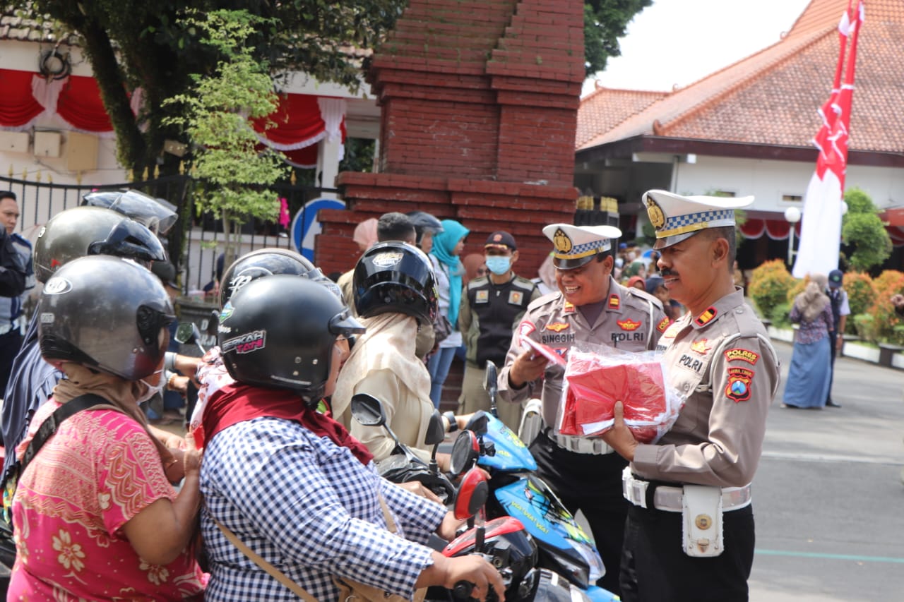 Sejumlah petugas yang merupakan anggota Polres Trenggalek ini turut membagikan bendera kepada setiap masyarakat atau pengendara yang kebetulan melintas didepan pendopo Kabupaten Trenggalek. Sedikitnya 10 ribu bendera disiapkan dalam kegiatan ini.