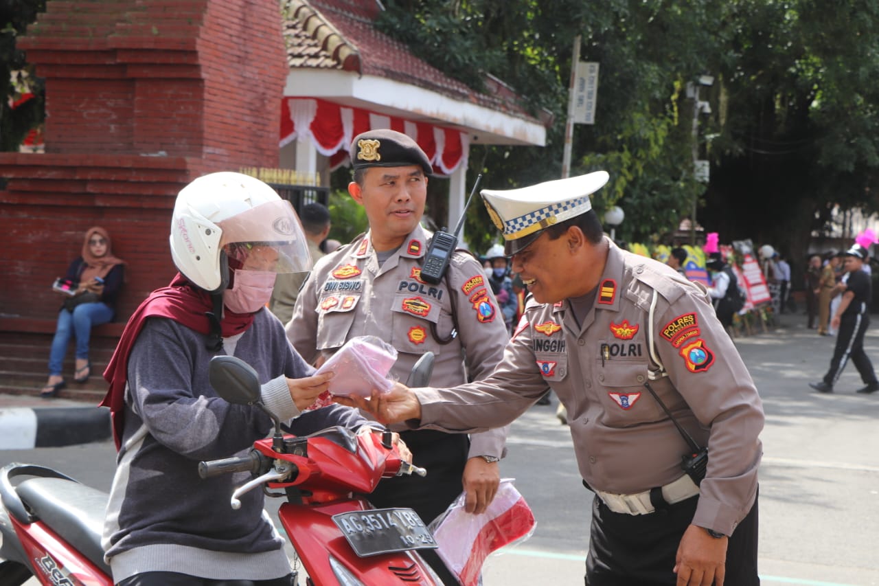 Sejumlah petugas yang merupakan anggota Polres Trenggalek ini turut membagikan bendera kepada setiap masyarakat atau pengendara yang kebetulan melintas didepan pendopo Kabupaten Trenggalek. Sedikitnya 10 ribu bendera disiapkan dalam kegiatan ini.