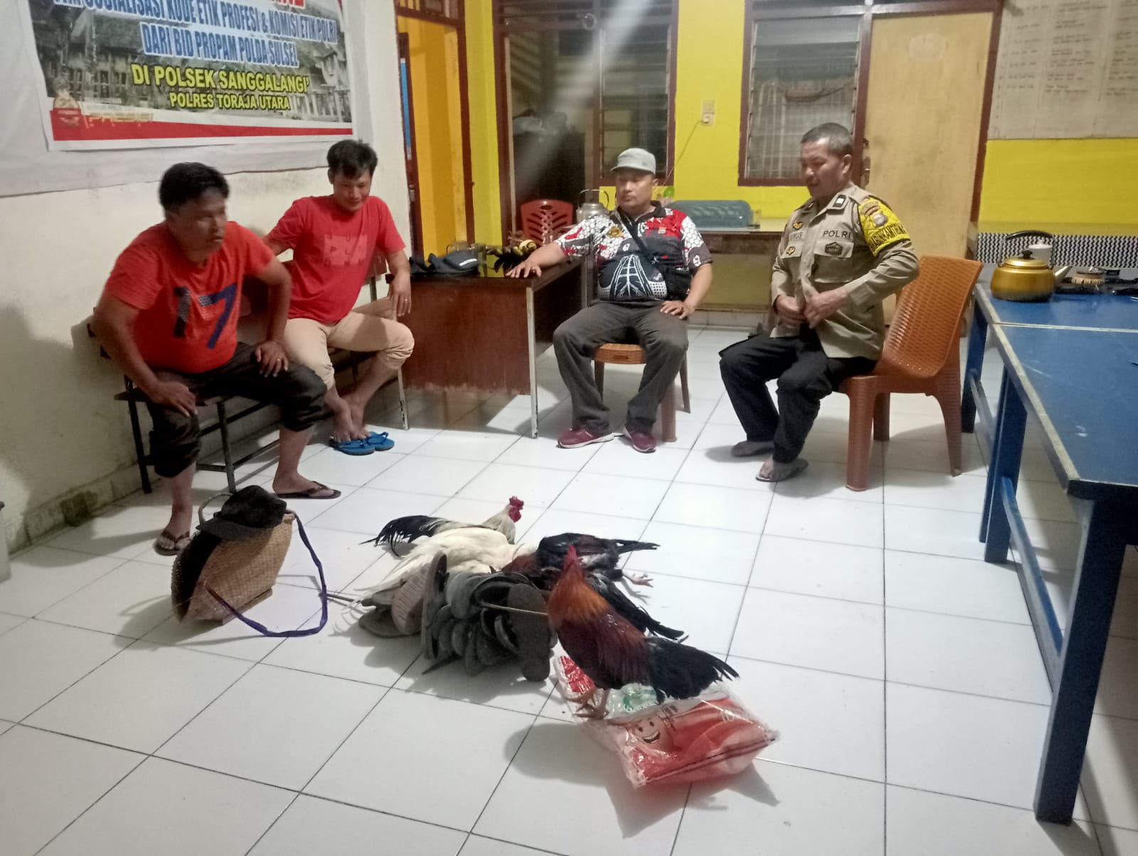 Dalam penggerebekan itu, Petugas berhasil mengamankan 3 ekor Ayam jantan hidup siap adu, 2 ekor bangkai ayam hasil aduan, 1 buah pakaian rompi yang dilepas pelaku saat akan diamankan, keranjang ayam, serta beberapa pasang sendal yang ditinggalkan para pelaku saat dilakukan penggerebekan. Barang bukti tersebut kemudian dimankan di Mapolsek Sanggalangi’.