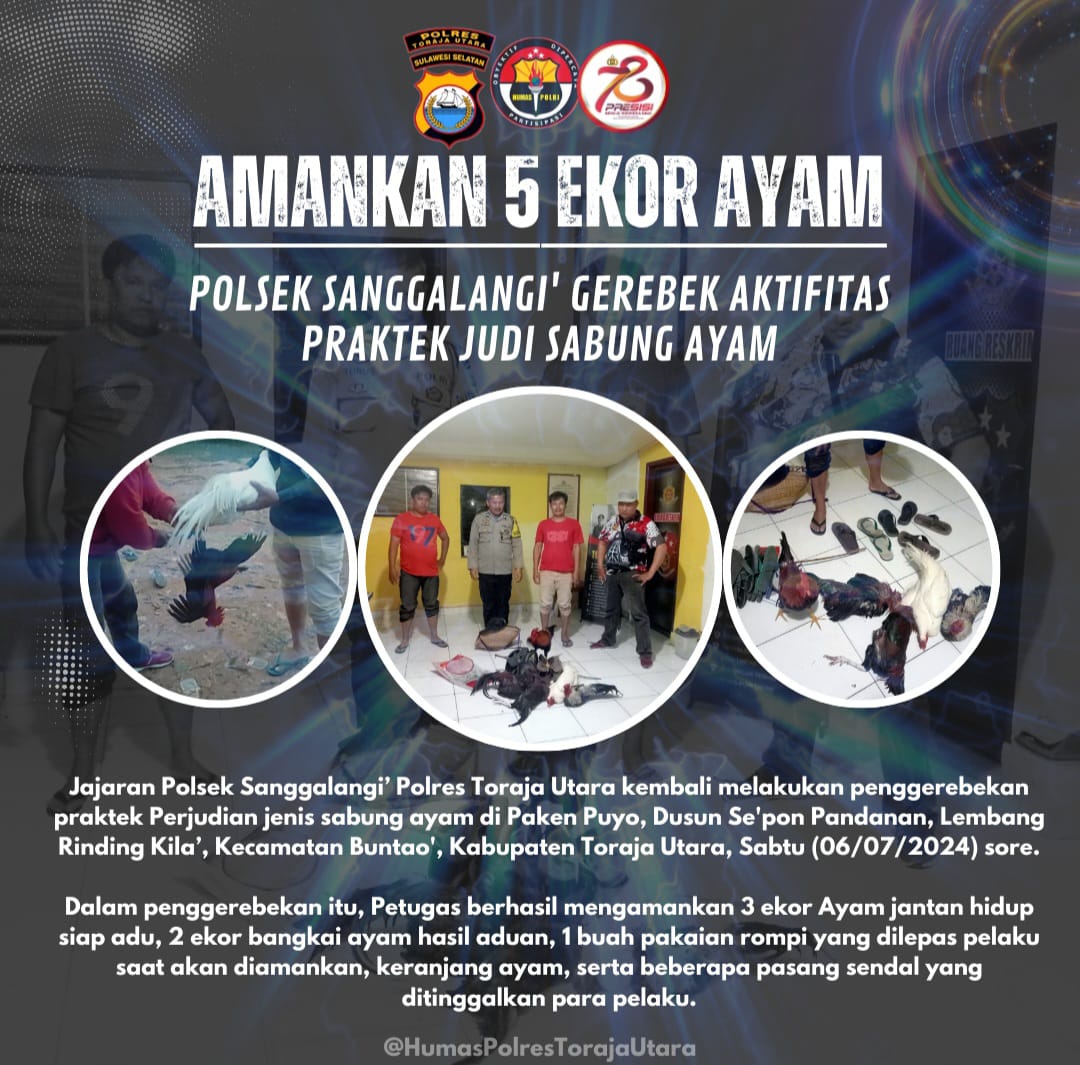 Jajaran Polsek Sanggalangi’ Polres Toraja Utara kembali melakukan penggerebekan praktek Perjudian jenis sabung ayam di Paken Puyo, Dusun Se’pon Pandanan, Lembang Rinding Kila’, Kecamatan Buntao’, Kabupaten Toraja Utara, Sabtu (06/07/2024) sore.