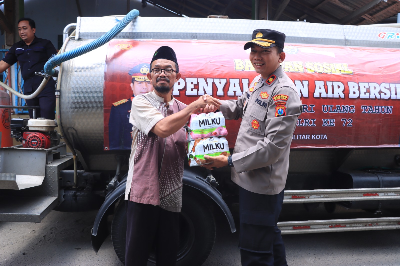 Lebih lanjut didampingi sejumlah personel Polres Blitar Kota dan personel Polsek Sananwetan, total lima ribu liter air bersih pun dibagikan kepada pondok pesantren Ibadurohman.