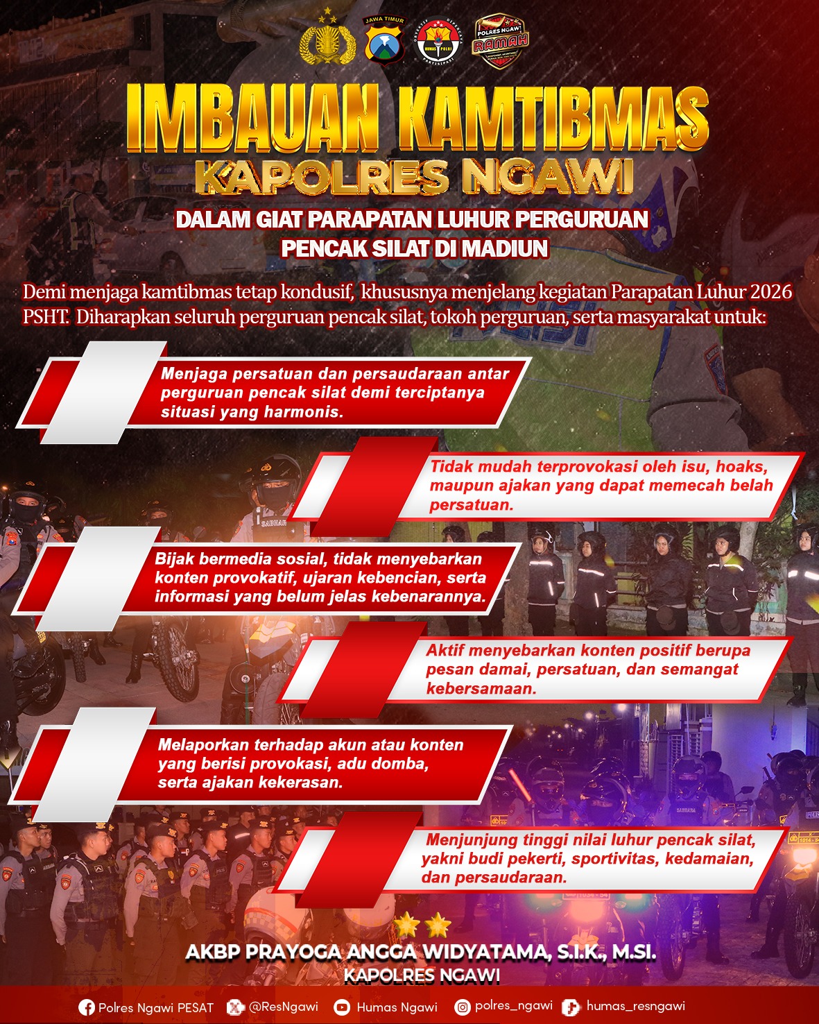 Ngawi, Pilarbangsa.co.id. Dalam rangka menjaga situasi kamtibmas yang aman, damai, dan kondusif, menjelang kegiatan Parapatan Luhur 2026, Kapolres Ngawi AKBP Prayoga Angga Widyatama, S.I.K., M.Si. mengimbau kepada seluruh perguruan pencak silat, tokoh perguruan, serta masyarakat untuk bersama-sama: