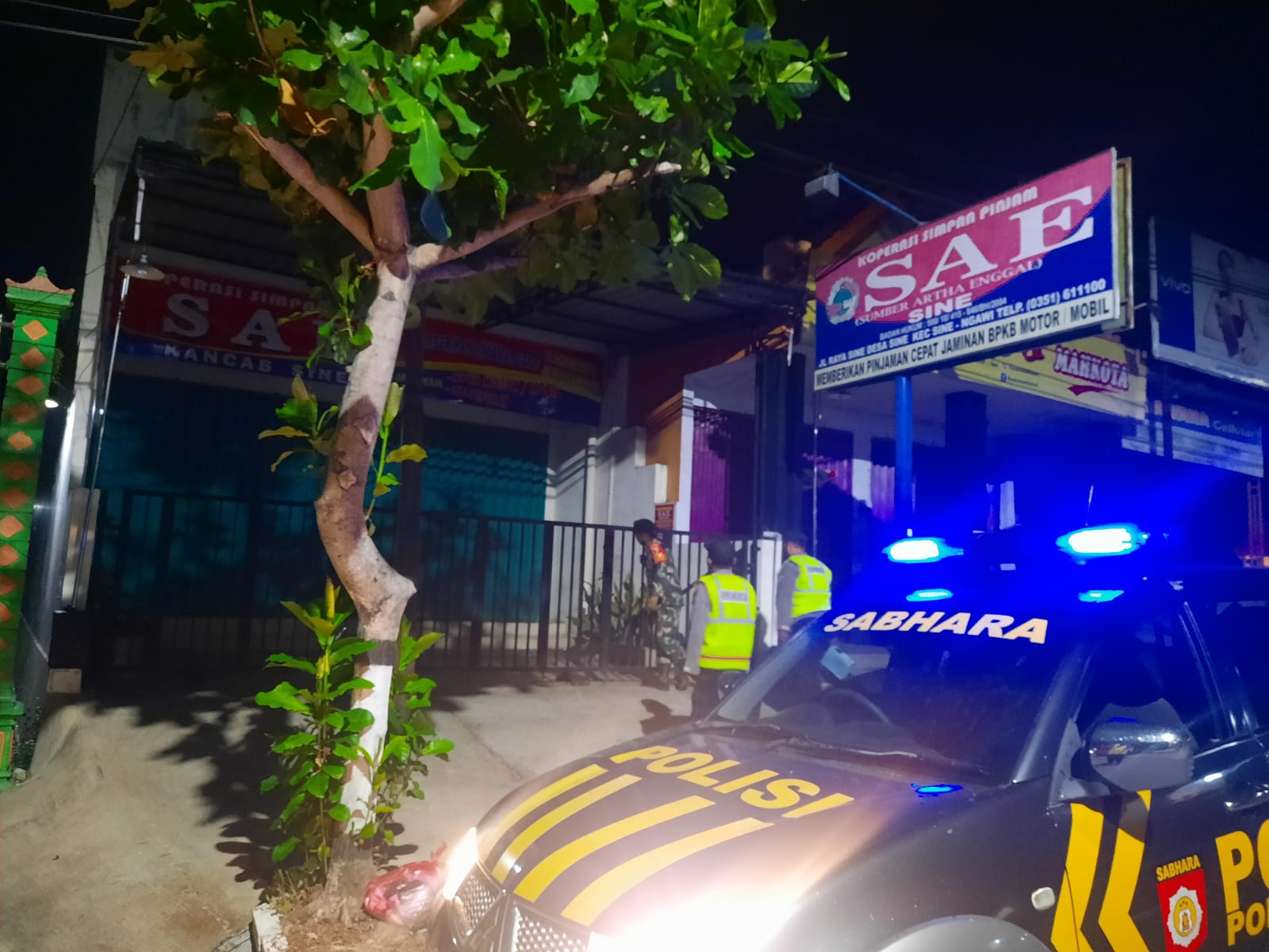 Kali ini, anggota Polsek dan Koramil Sine berpatroli di beberapa obyek vital, diantaranya Bank BRI Unit Sine, Bank BPR, Bank Jatim, Koperasi Sae, pada Selasa (6/2/2024)