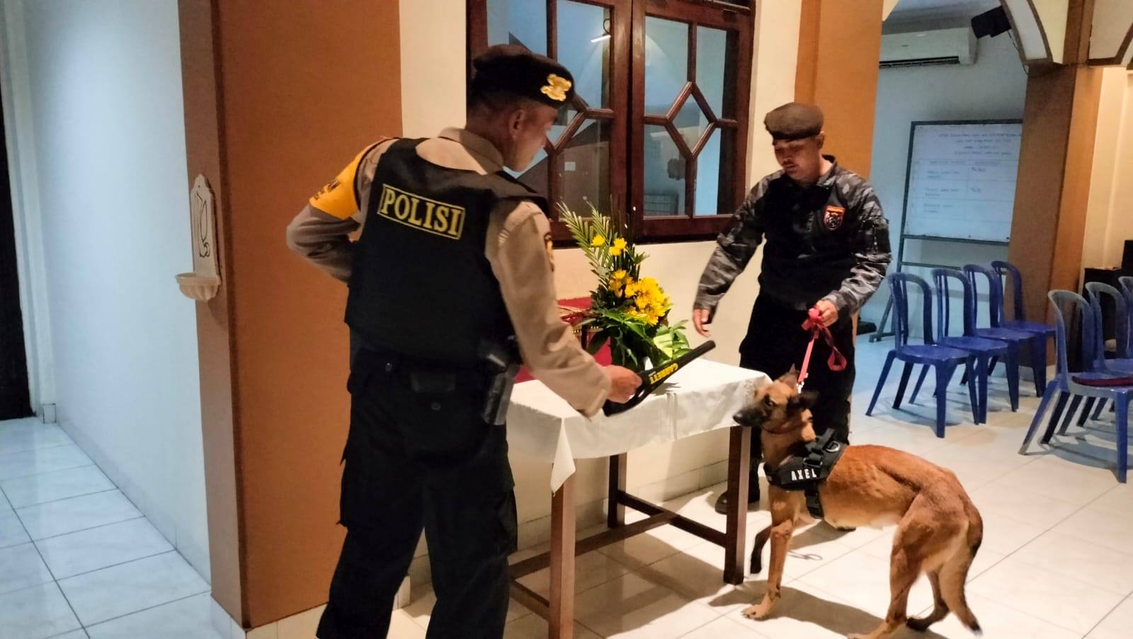 Tiba dilokasi, dengan menggunakan alat metal dan miror detektor serta dibantu unit satwa K-9, petugas menyisir setiap sudut gereja untuk melakukan pemeriksaan mulai dari serambi, altar utama hingga tempat duduk jemaat.