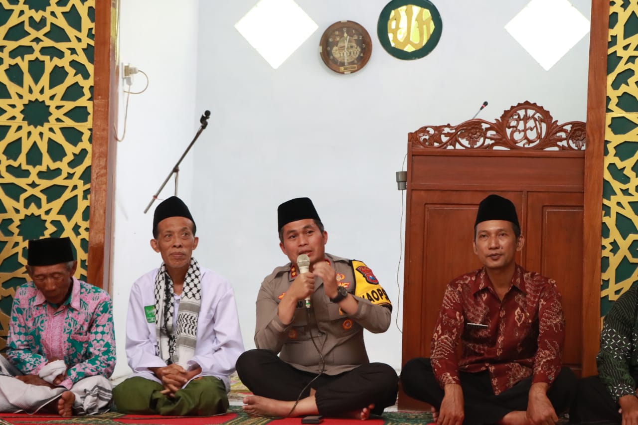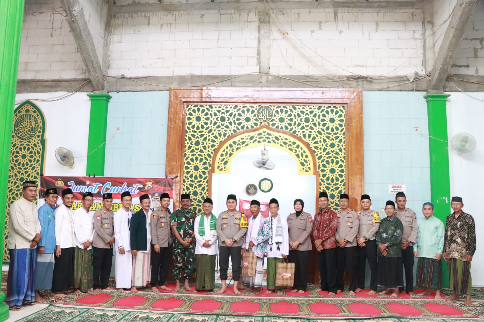 Kapolres Nganjuk AKBP Muhammad, S.H., S.I.K., M.Si., didampingi Wakapolres Nganjuk Kompol Mustijat Priyambodo, S.I.K., M.H., Kapolsek Rayon 3 jajaran Polres Nganjuk dan Forkopimcam Kertosono, Tokoh Agama Desa Nglawak Kyai Hasan Bisri dan tokoh agama kecamatan Kertosono H Mudawim, M. Pd. melaksanakan Jum’at Curhat program Quick Wins Presisi TW IV tahun 2023 untuk Mengajak para jamaah bersama-sama menciptakan pemilu 2024 yang damai. (22/12/2023).