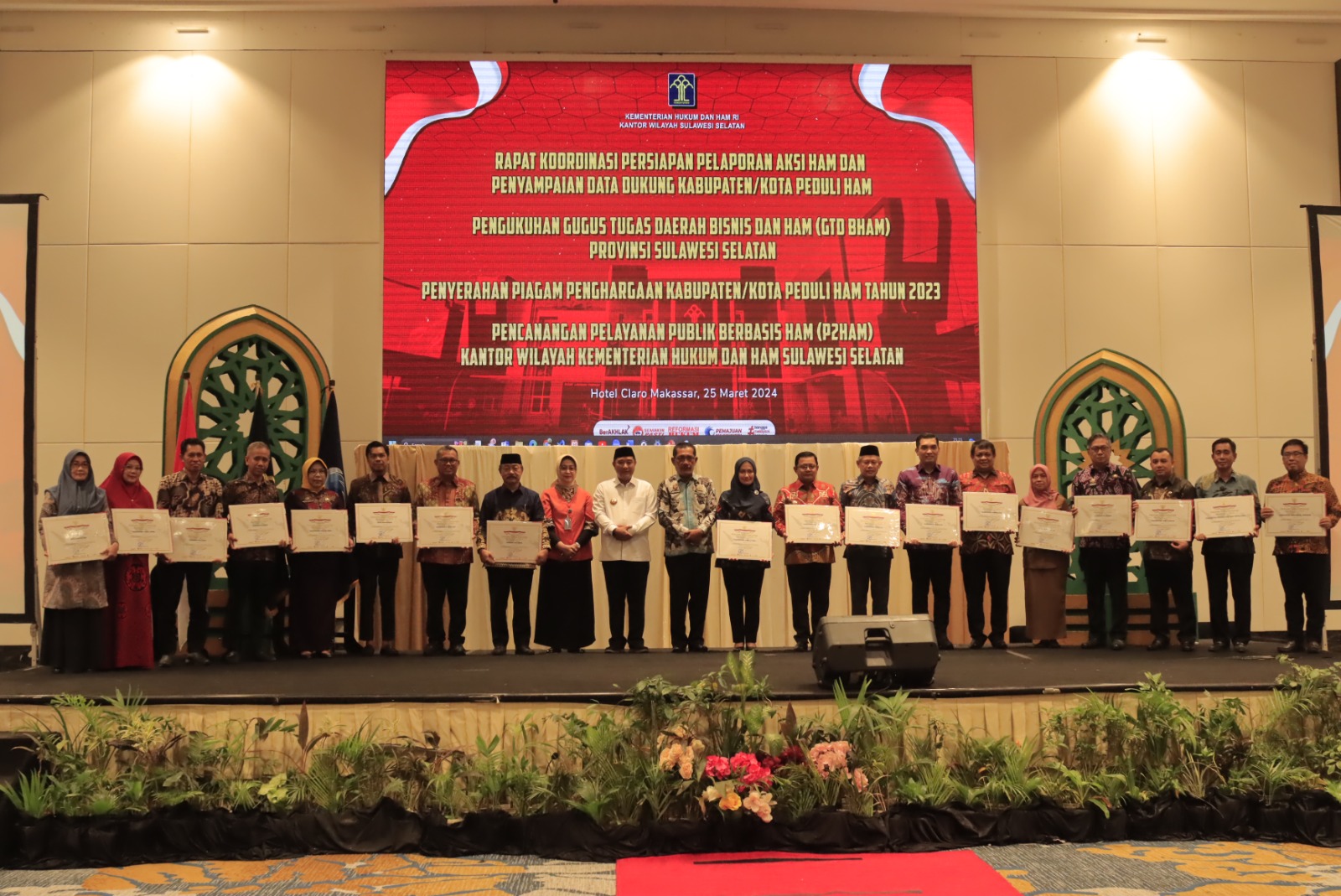 Dirjen Hak Asasi Manusia, Kementerian Hukum dan HAM RI, tetapkan Takalar sebagai Kabupaten Peduli Hak Asasi Manusia (HAM) Tahun 2023 di Hotel Claro Makassar, Senin (25/3/2024) malam.