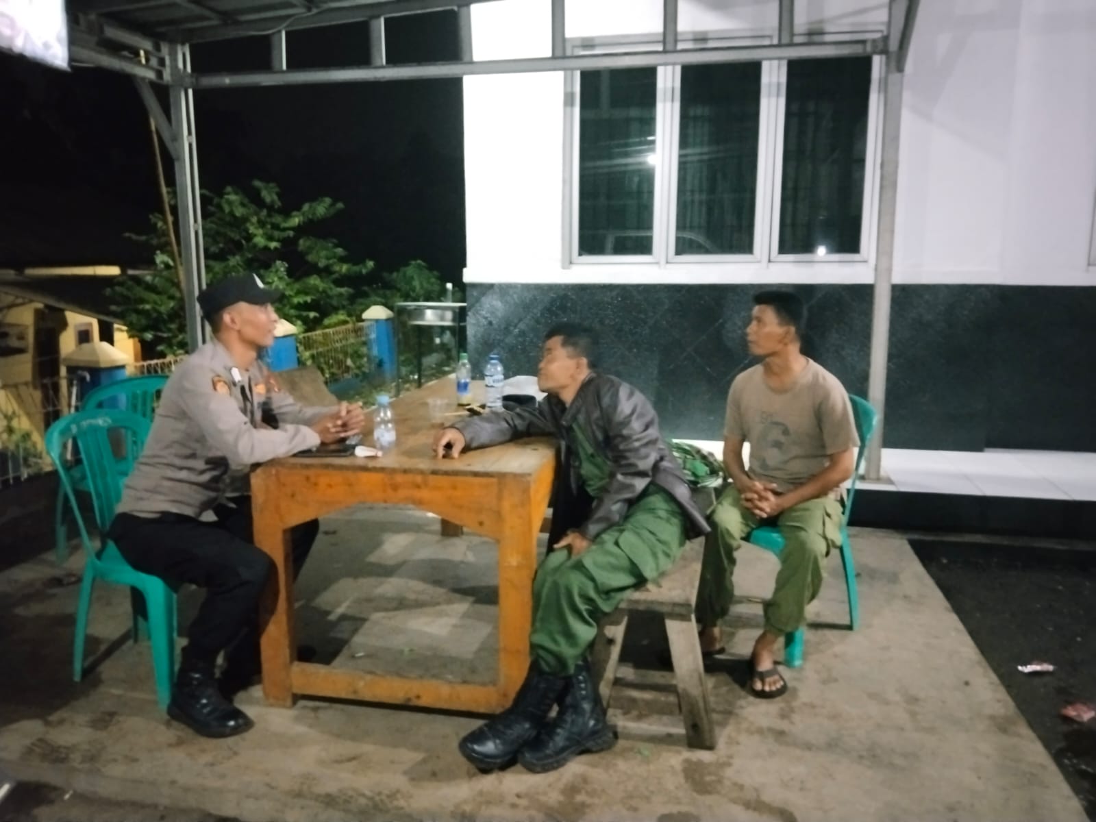 Bhabinkamtibmas Polsek Pangkalan Polres Karawang Polda Jabar Bripka Indra Lesmana ngawangkong bersama anggota Linmas di Kantor Desa Tamanmekar, Kecamatan Pangkalan, Kabupaten Karawang, Minggu (3/3/2024)