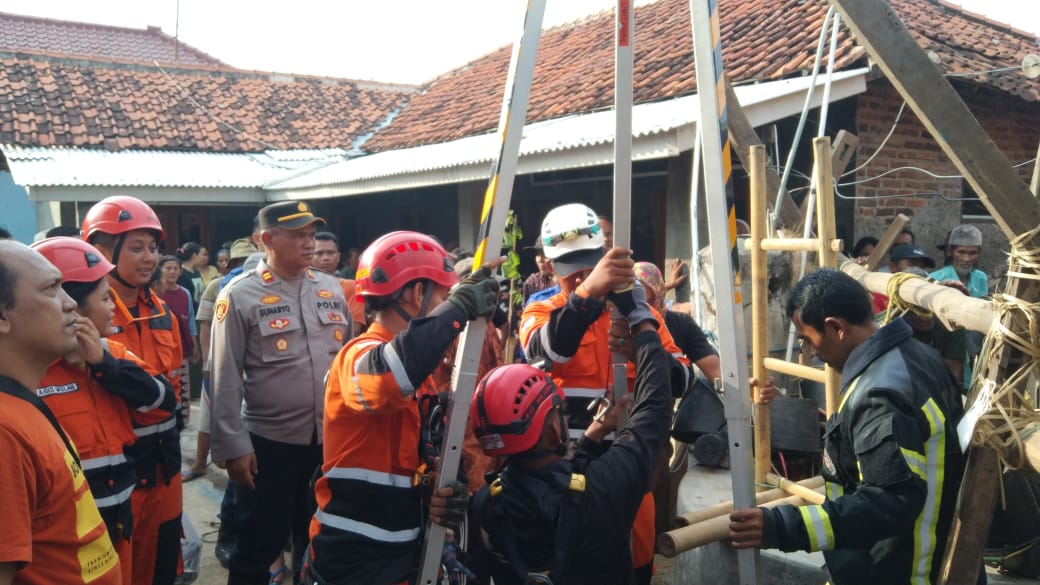 Kapolsek Lelea Polres Indramayu Polda Jabar , Iptu Sunaryo, memimpin evakuasi korban yang terjebak di dalam sumur sepanjang 12 meter di Desa Tugu.