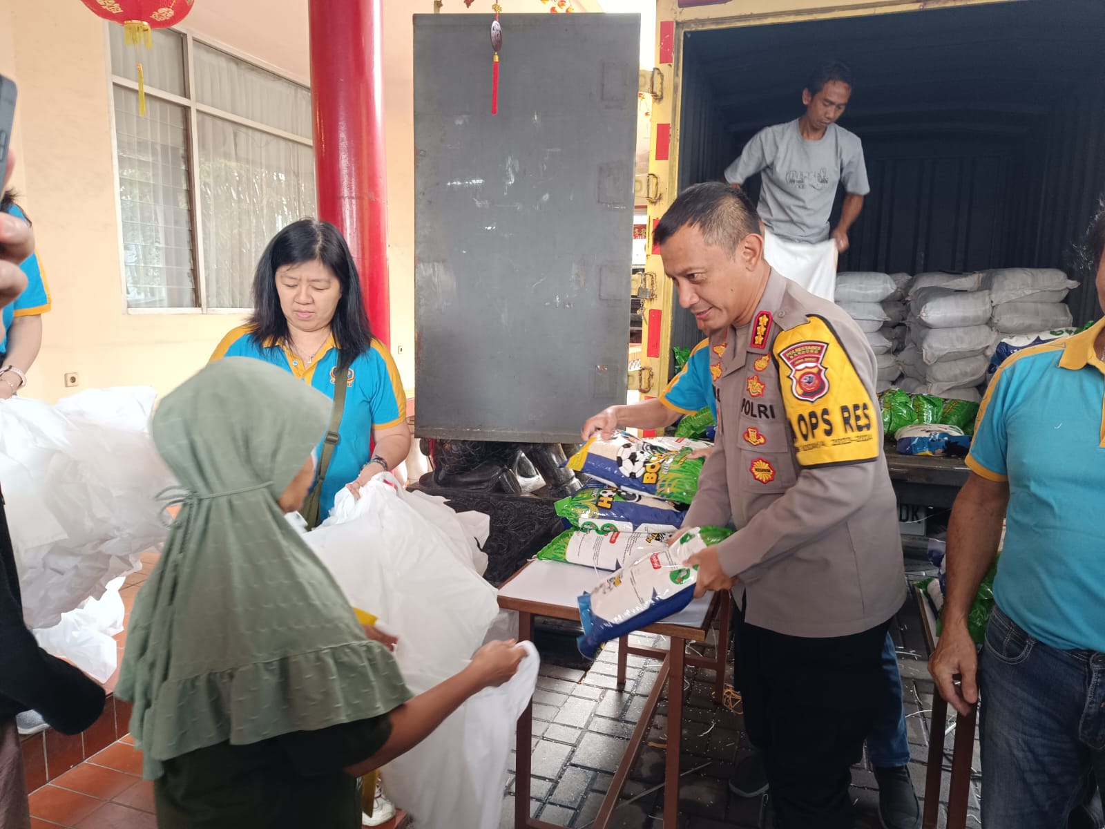 Kapolrestabes Bandung Kombes Pol Dr. Budi Sartono, S.i,k, M.Si,M.Han saat membantu menyalurkan sembako di pasar murah MTP di Gedung YDSP di Jalan Nana Rohana, Kota Bandung pada Kamis 14 Maret 2024.