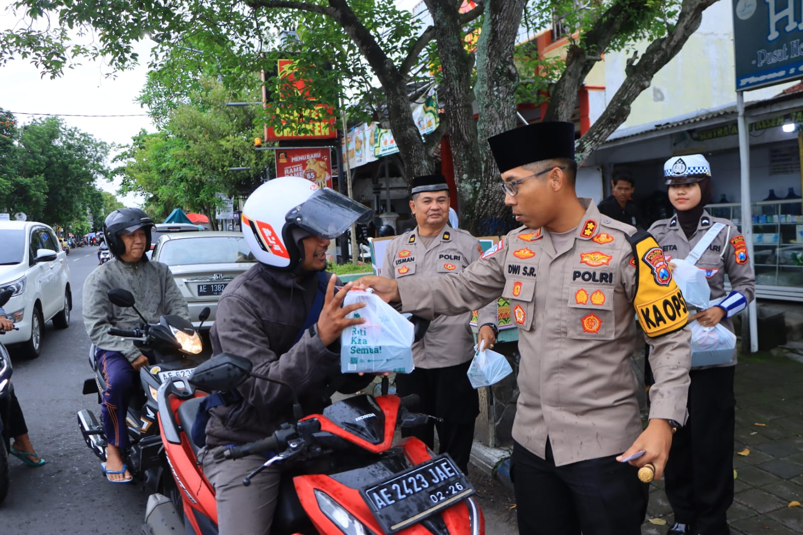 Mantan Kapolres Situbondo tersebut didampingi Wakapolres Kompol Andy Purnomo, S.H., S.I.K., M.H., bersama Kasat Lantas AKP Yuliana Plantika, S.T.K., S.I.K., M.Si., dan Polwan Polres Ngawi selain membagikan takjil, juga memberikan imbauan kamtibmas kepada pengguna jalan yang melintas di jalan JA. Suprapto, Ngawi.