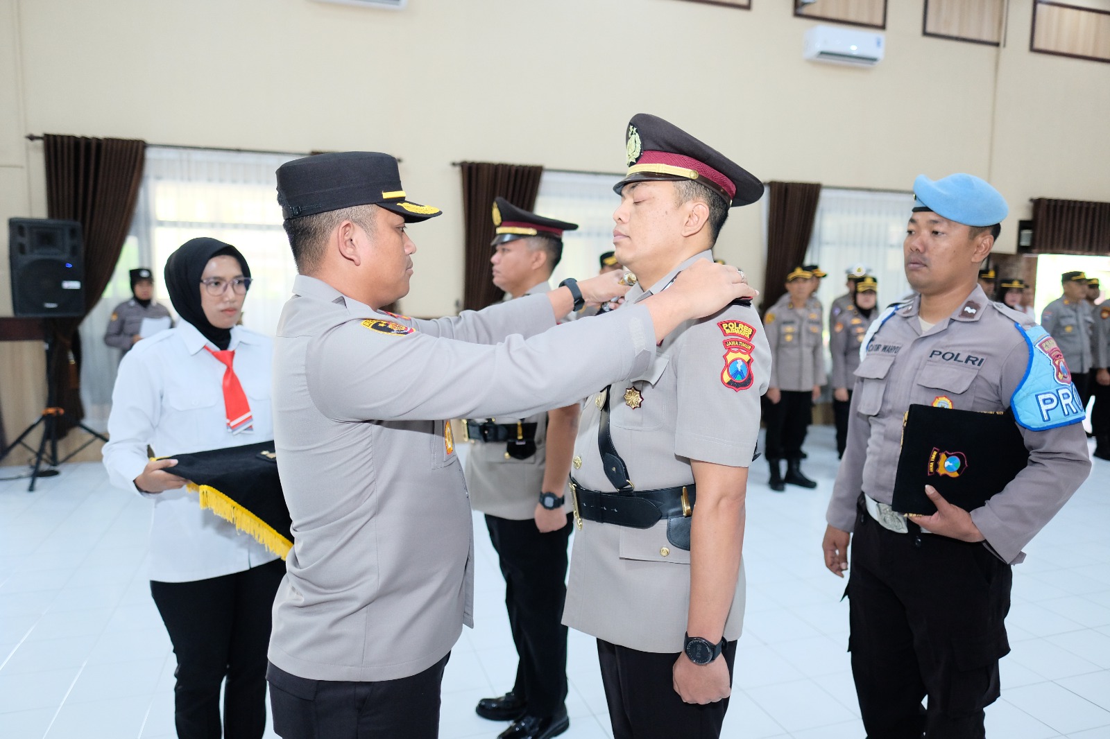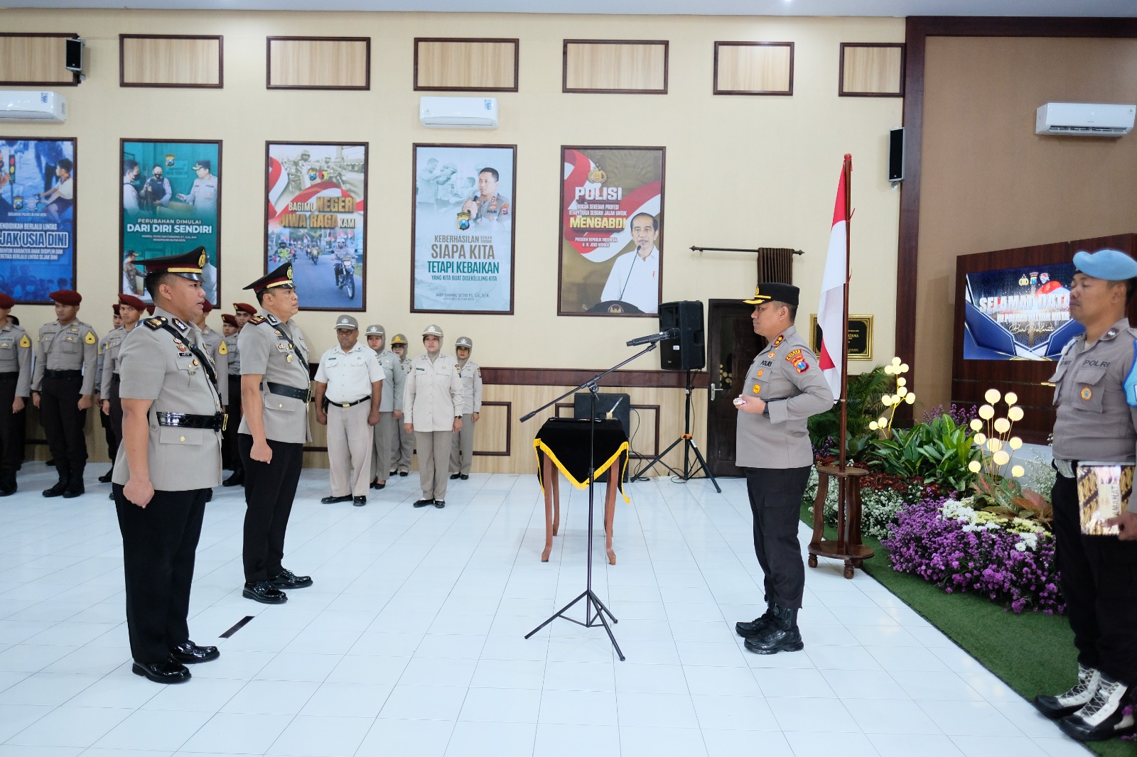 Kapolres Blitar Kota AKBP Danang Setiyo P.S S.H S.I.K memimpin serah terima jabatan (Sertijab) Kasatreskrim dan kanaikan pangkat pengabdian di Gedung Patriatama Mapolres Blitar Kota, Senin (02/10/2023).