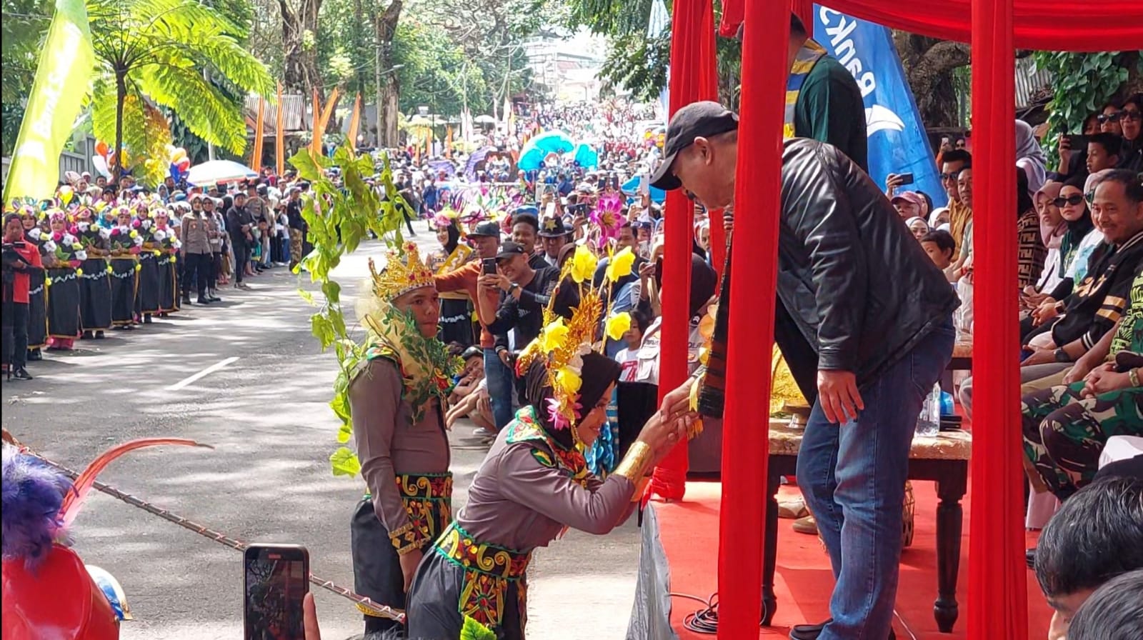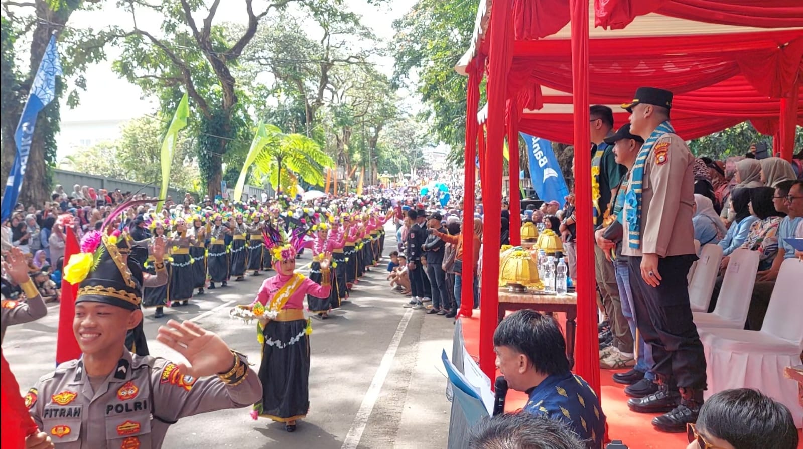Kapolres Gowa dan jajaran Forkopimda menyambut peserta karnaval dengan penuh semangat dari panggung kehormatan.