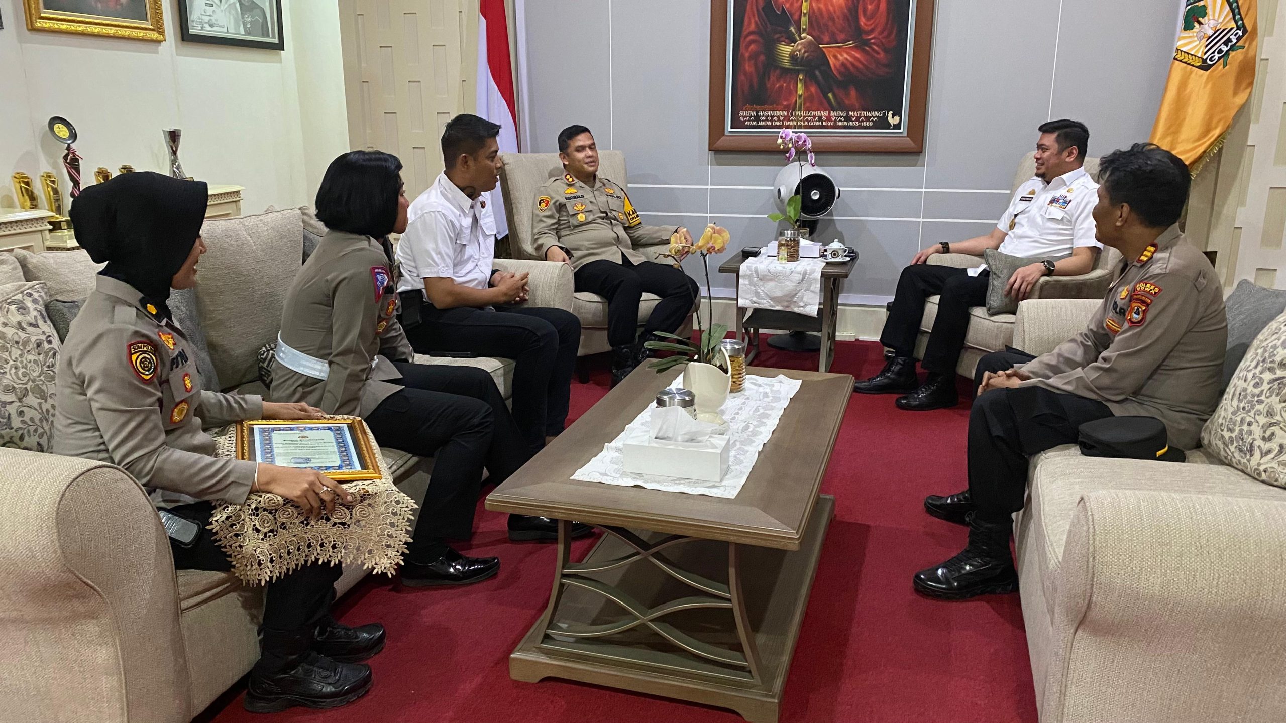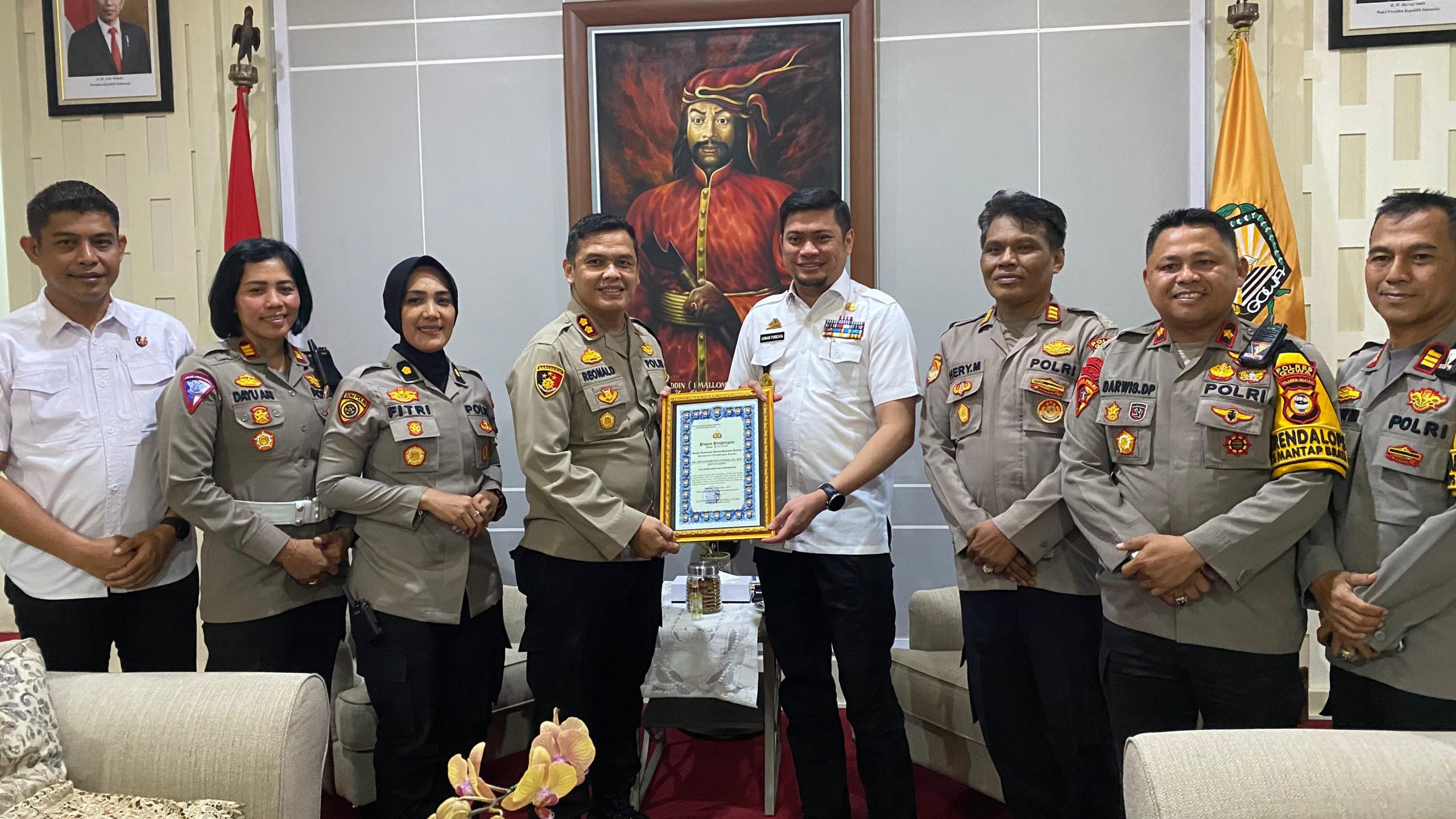 Kapolres Gowa AKBP R.T.S Simanjuntak, S.H., S.I.K., M.M., M.I.K., bersama beberapa Pejabat Utama (PJU) Polres Gowa, mengadakan acara penyerahan Piagam penghargaan kepada Bupati Gowa Adnan Purichta YL.