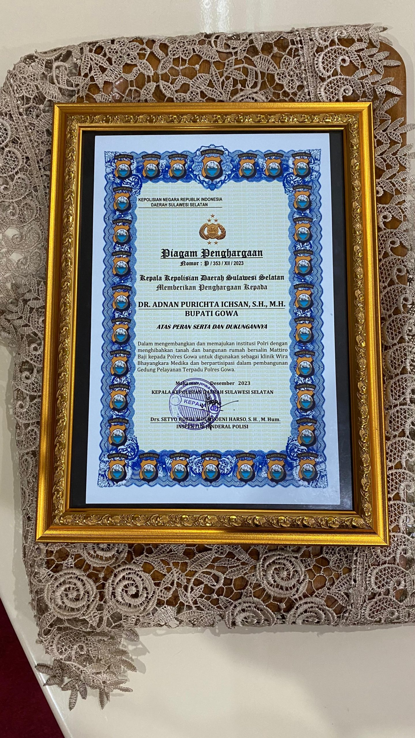 Penghargaan dari mantan Kapolda Sulsel IRJEN POL Drs. Setyo Boedi Moempoeni Harso, S.H., M. Hum. diberikan kepada Bupati Gowa Adnan Purichta. YL sebagai apresiasi atas kontribusi Bupati Gowa dalam mengembangkan dan memajukan Institusi Polri khusus Polres Gowa, Rabu (31/01/2024).