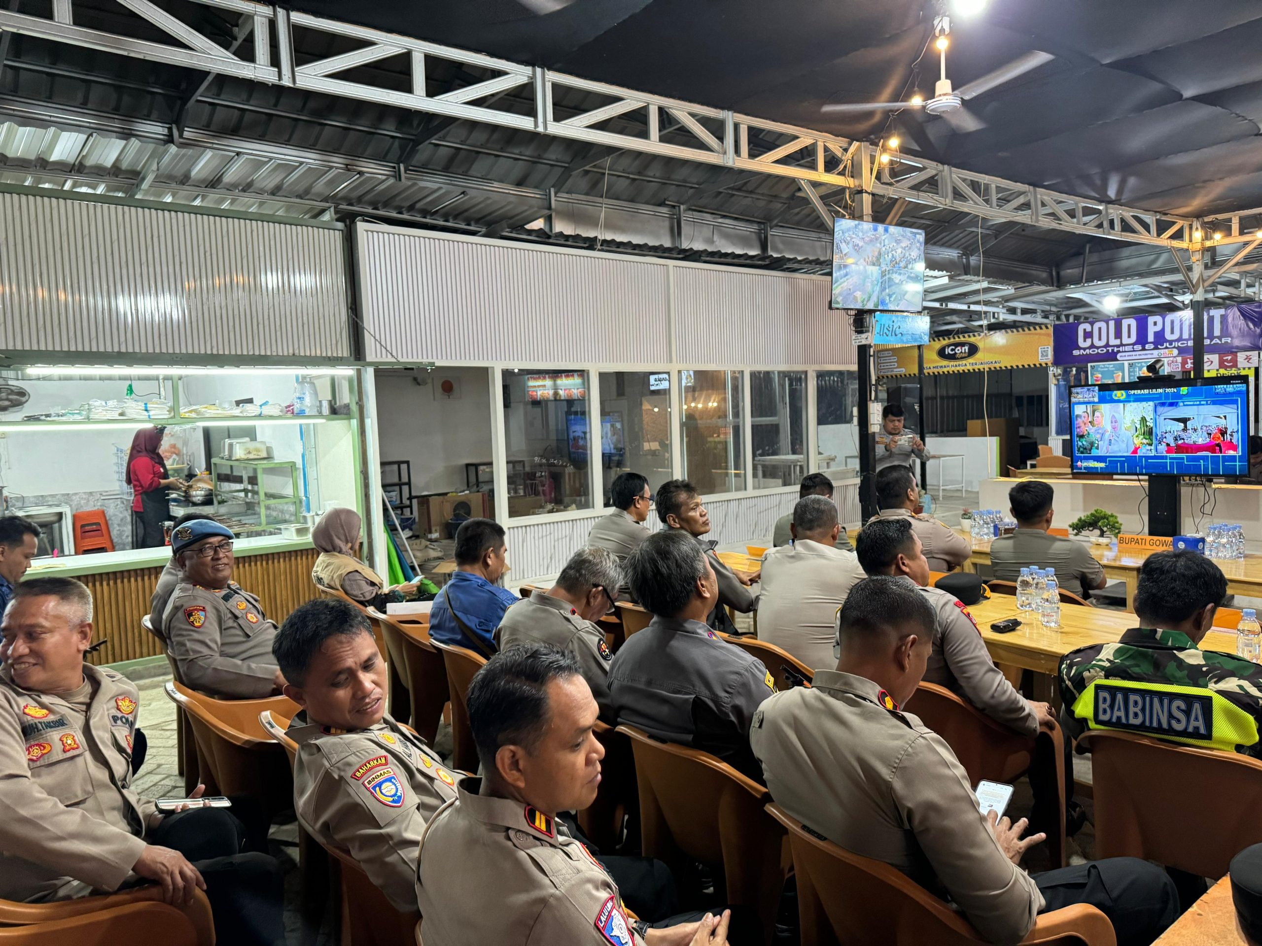 Gowa, Pilarbangsa.co.id. Kapolres Gowa AKBP R.T.S Simanjuntak, S.H., S.I.K., M.M., M.I.K., didampingi Wakapolres Gowa KOMPOL Gani, S.H., M.H., bersama para Pejabat Utama (PJU) Polres Gowa dan Forkopimda Gowa mengikuti Zoom Meeting yang digelar di Pos Pengamanan (Pospam) Samata, Selasa (31/12/2024) Malam.