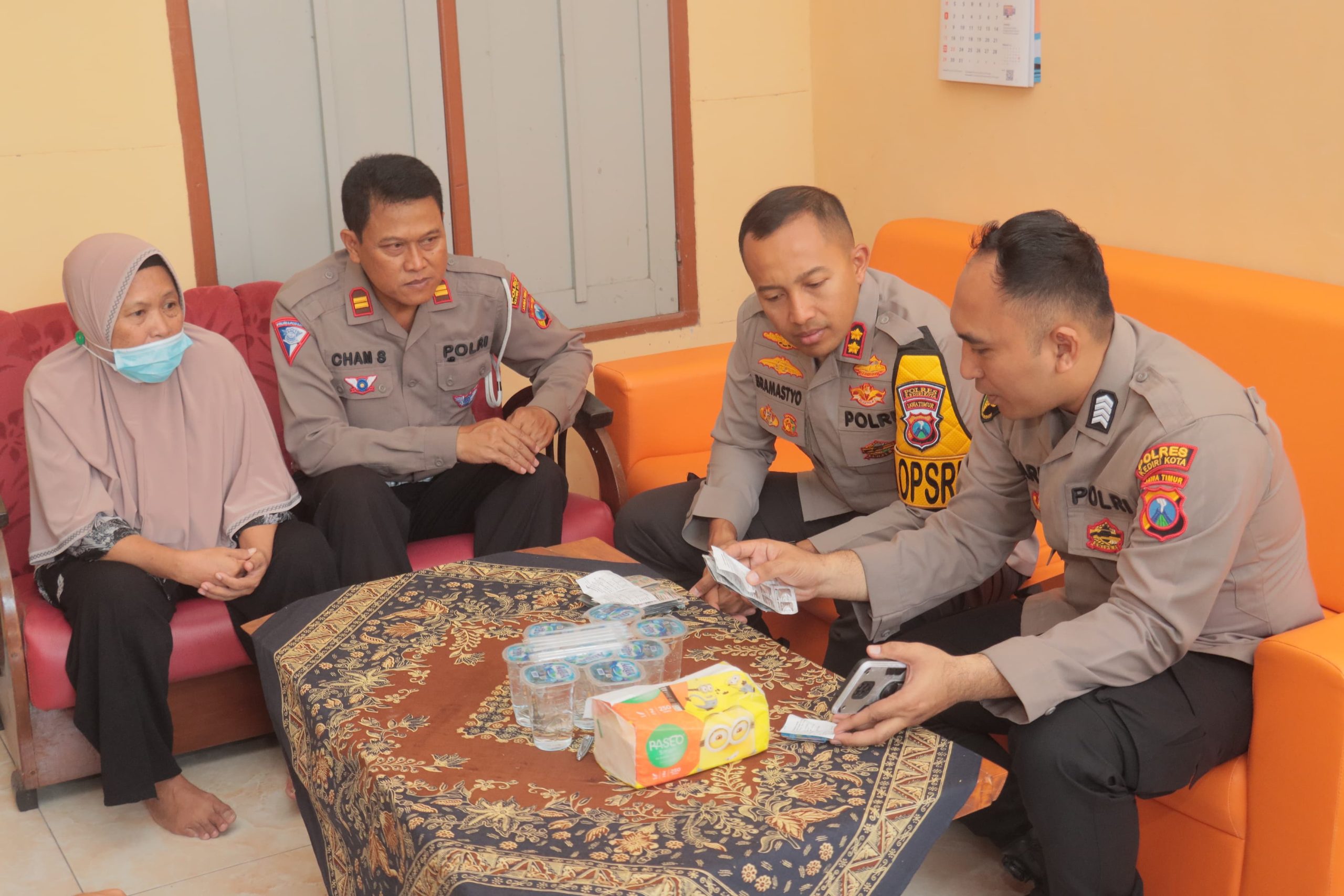 Kapolres Kediri Kota, AKBP Bramastyo Priaji, S.H., S.I.K., M.Si. didampingi Wakapolres Kediri Kota Kompol Dodik Tri Hendro Siswoyo, S.H., S.I.K., M.I.K. berkunjung dan melakukan anjangsana kegiatan baksos serta melakukan pengecekan kesehatan, Penata Tingkat I Sri Wahyuningsih anggota Sidokkes Polres Kediri Kota dikediamanya, Kelurahan Bandar Lor Kec. Mojoroto Kota Kediri,Senin (27/5/2024).