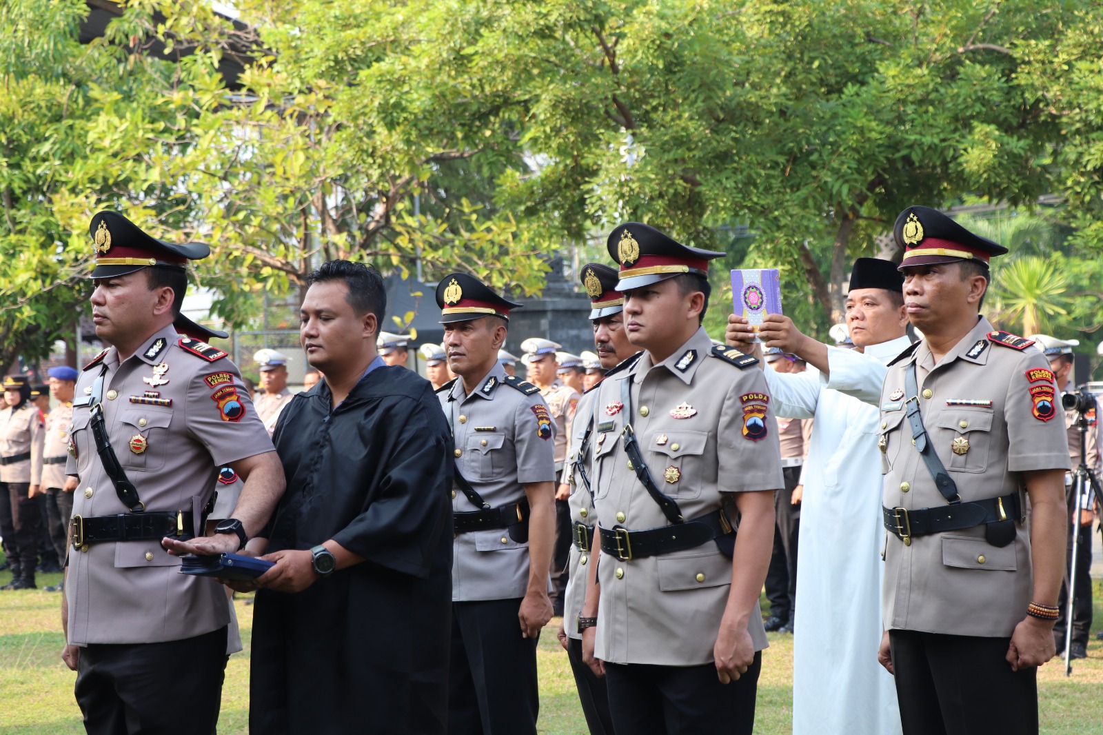 Kapolres Kendal AKBP Feria Kurniawan SIK memimpin upacara serah terima jabatan (sertijab) Kasat Reskrim, Kasat Lantas, Kapolsek dan Kasihumas Polres Kendal di lapangan apel Mapolres Kendal, Senin (30/10/2023).