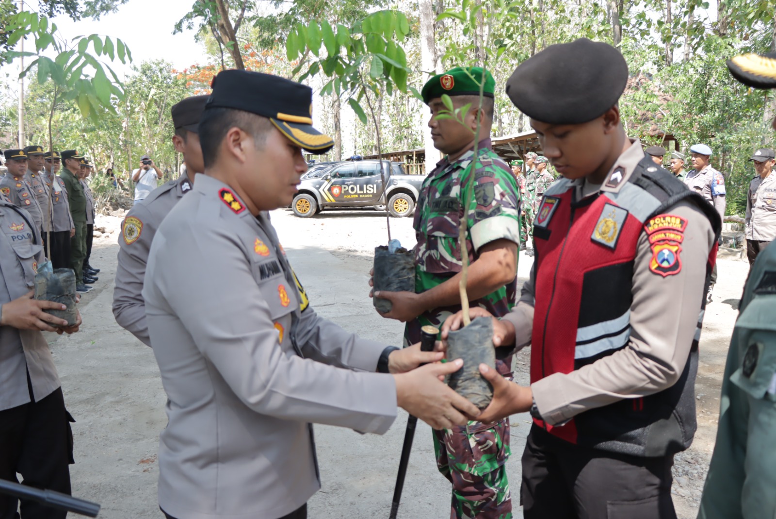 Acara penanaman pohon massal yang dihadiri oleh Ibu Ketua dan pengurus Cabang Bhayangkari Nganjuk, Pejabat Utama (PJU) Perhutani dan Polres Nganjuk, Forkopimcam Bagor, perwakilan Kapolsek, anggota TNI/Polri, Perhutani, serta ketua Lembaga Masyarakat Desa Hutan (LMDH).
