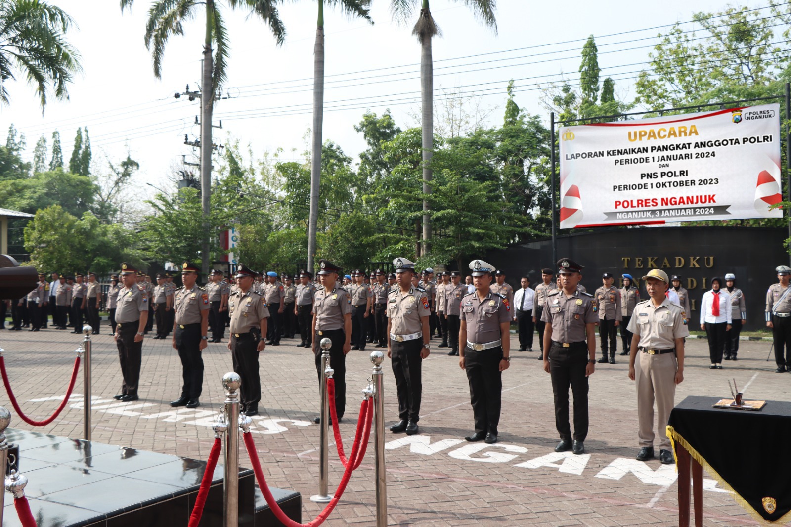Kapolres Nganjuk, AKBP Muhammad, S.H., S.I.K., M.Si., memimpin upacara Korp Raport Kenaikan Pangkat 93 Anggota Polri dan ASN satu tingkat lebih tinggi periode 1 Januari 2024.Upacara dilaksanakan di lapangan apel Polres Nganjuk, dihadiri oleh para Pejabat Utama (PJU), Kapolsek jajaran, anggota Polres Nganjuk dan Bhayangkari, Rabu (03/01/2024).