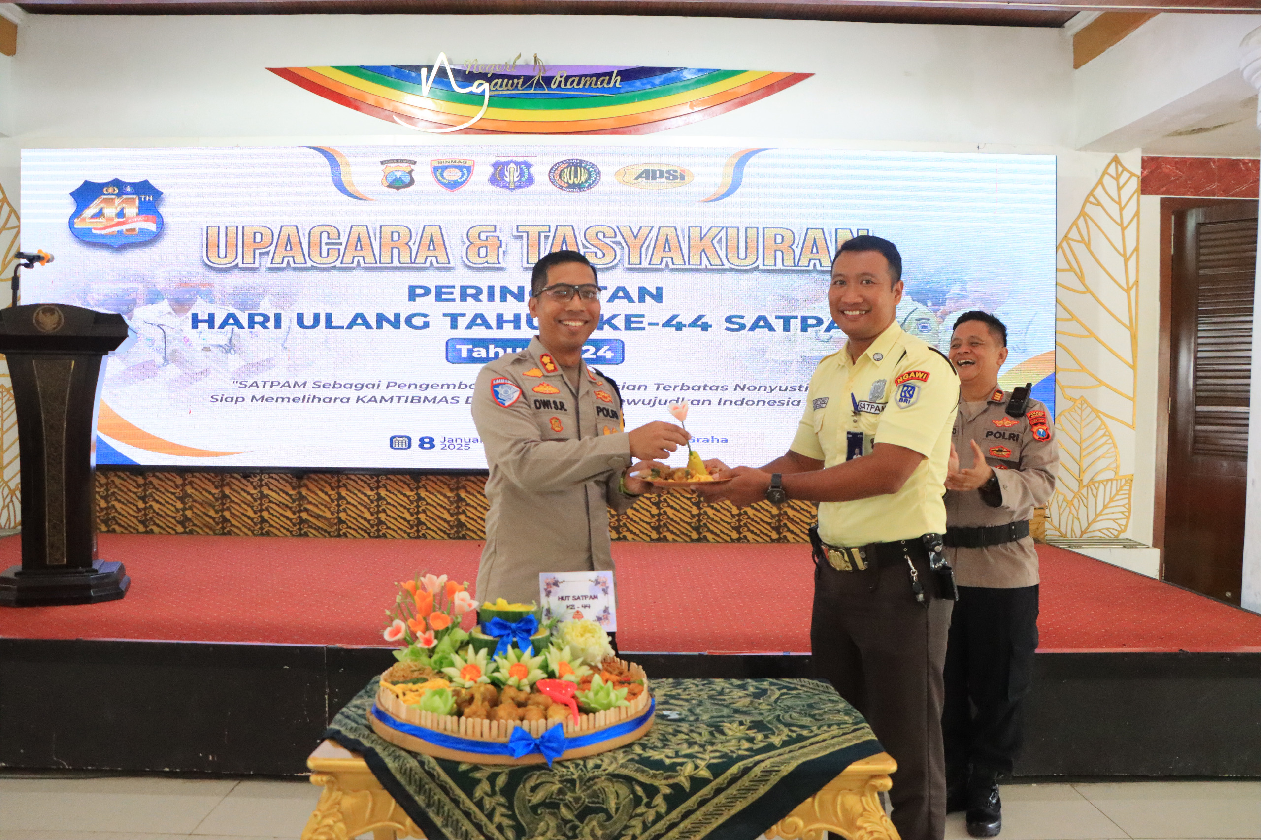 Dalam perayaan Hari Ulang Tahun Satuan Pengamanan (Satpam) ke-44 tahun 2024, yang dilaksanakan di Pendopo Wedya Graha Kabupaten Ngawi, Kapolres Ngawi AKBP Dwi Sumrahadi Rakhmanto, S.H., S.I.K., M.H., menyampaikan ucapan selamat dan apresiasi yang mendalam kepada seluruh anggota Satpam.