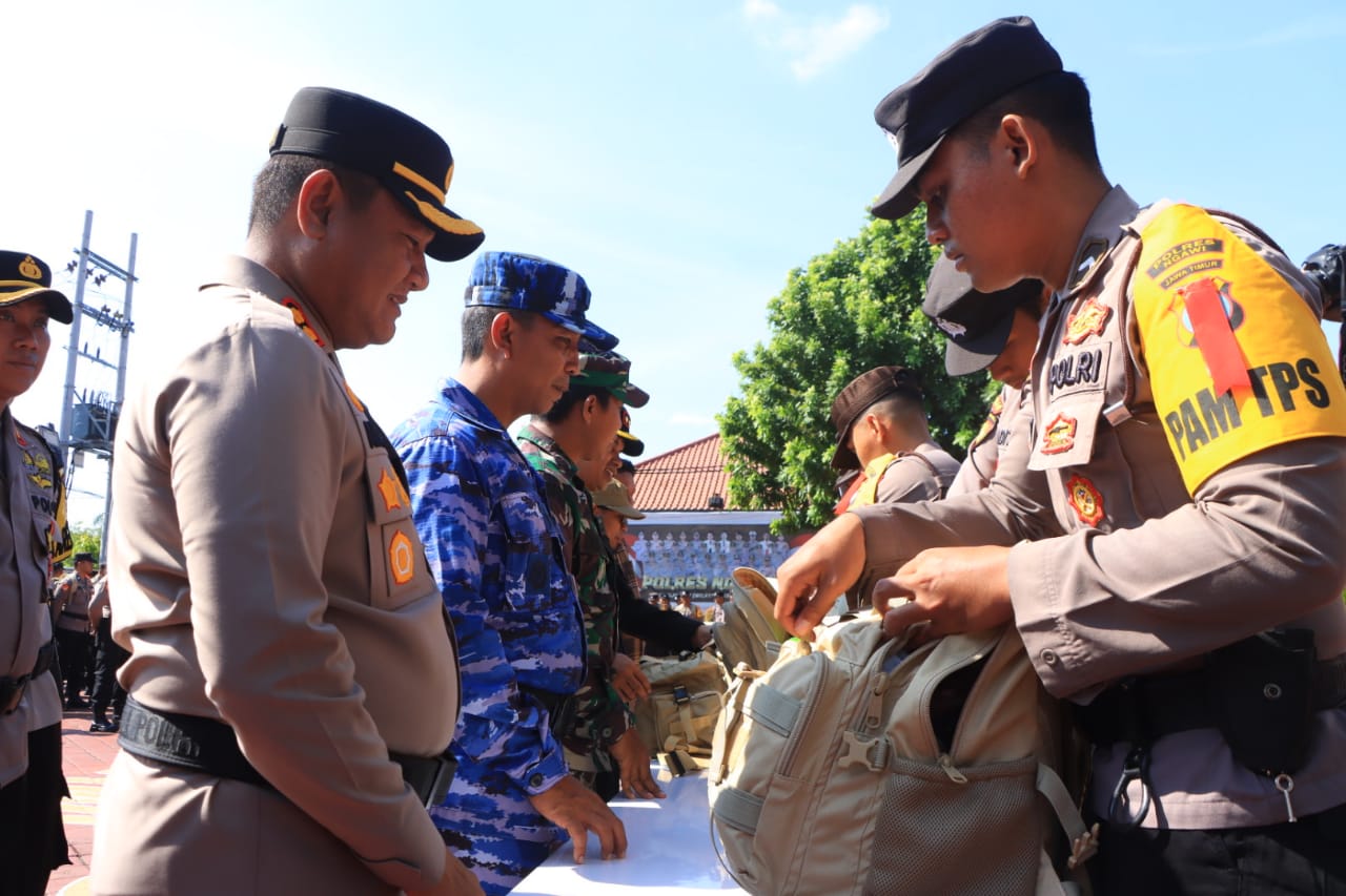 Kapolres Ngawi AKBP Argowiyono, S.H., S.I.K., M.Si didampingi Dandim 0805 Ngawi Letkol Arm Didik Kurniawan memimpin apel kesiapan pengamanan Tempat Pemungutan Suara (TPS) dan patroli skala besar menjelang pemungutan suara Pemilu 2024, Selasa (13/2/2024)