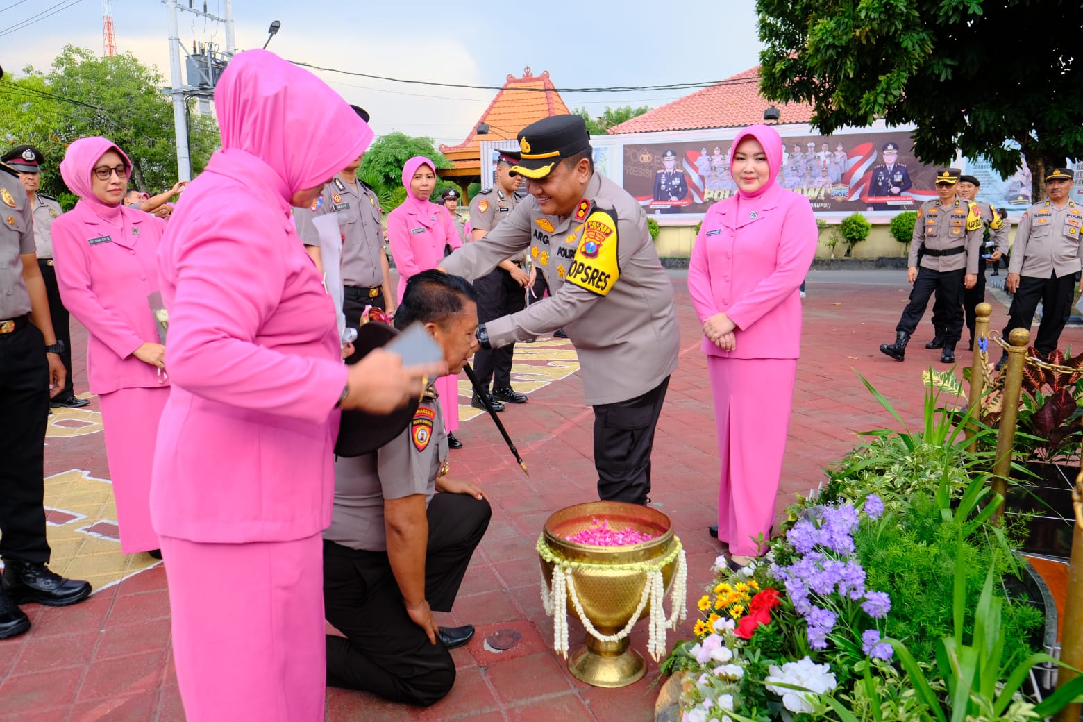 Sebagai bentuk rasa syukur, perwakilan anggota yang naik pangkat diguyur dengan air bunga oleh Kapolres dan Ketua Bhayangkari Cabang Ngawi Ny. Marina Argo diikuti para PJU, kemudian seluruh anggota yang naik pangkat disemprot dengan air menggunakan mobil pemadam kebakaran dengan posisi bersujud (mencium bumi), suka cita mewarnai Polres Ngawi pada Minggu sore (31/12/2023)