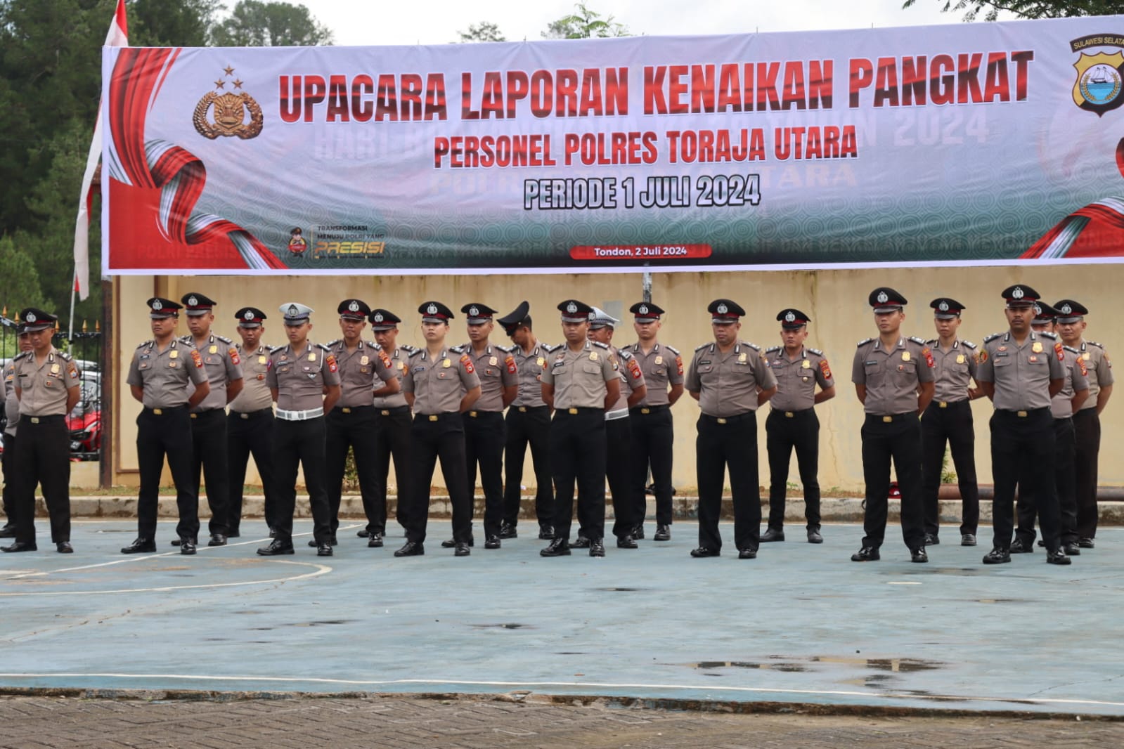 Kepolisian Resor Toraja Utara Polda Sulsel menggelar Upacara Korps Raport Kenaikan Pangkat terhadap 26 Personel di Halaman Mapolres Toraja Utara Panga Kecamatan Tondon Kabupaten Toraja Utara, Selasa (02/07/2024).