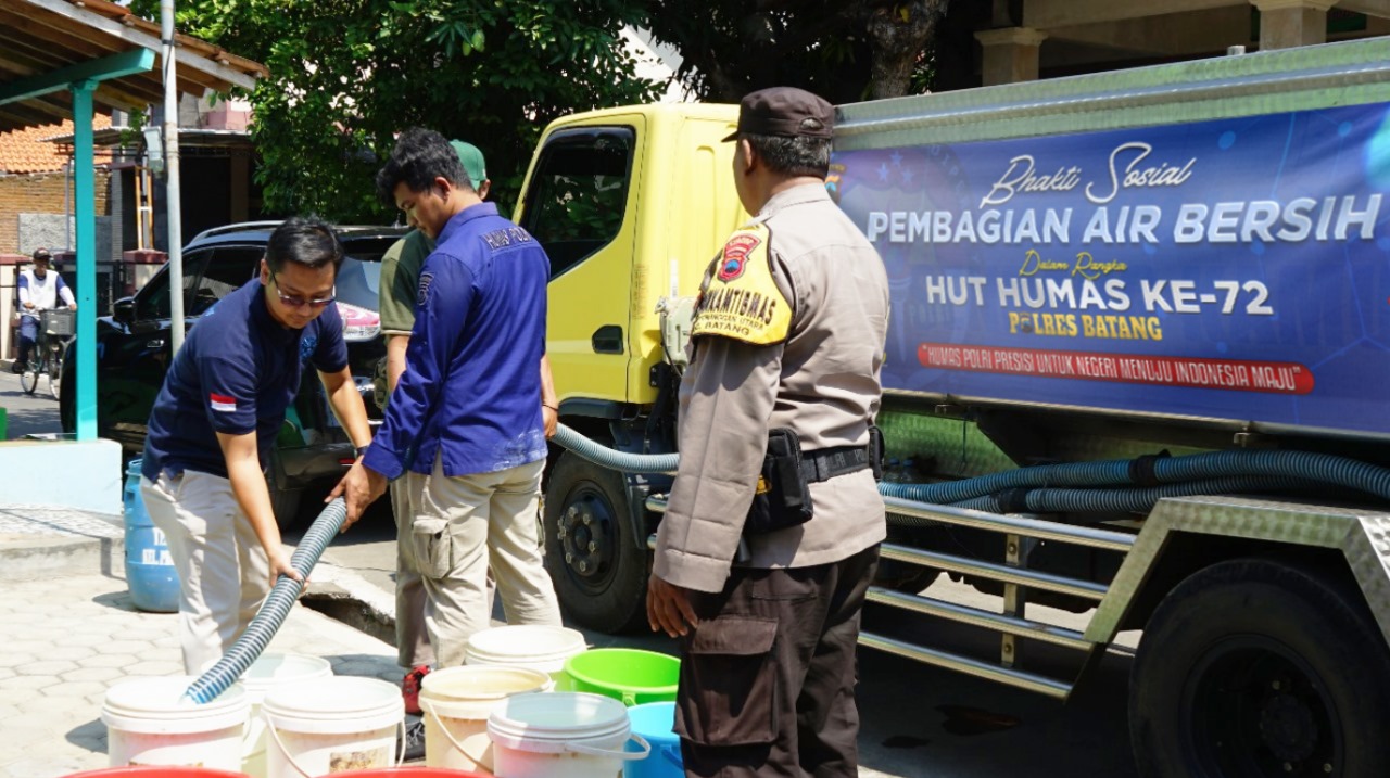 Humas Polres Batang bersama PDAM Kabupaten Batang melakukan bakti sosial dengan memberikan bantuan air bersih kepada warga di Gang Bowogonto, Dukuh Kebonan, Kelurahan Proyonanggan Utara. Kegiatan ini dipimpin oleh Kepala Seksi Humas Polres Batang, AKP Busono, sebagai bagian dari perayaan HUT ke -72 Humas Polri, Rabu (4/10/2023).