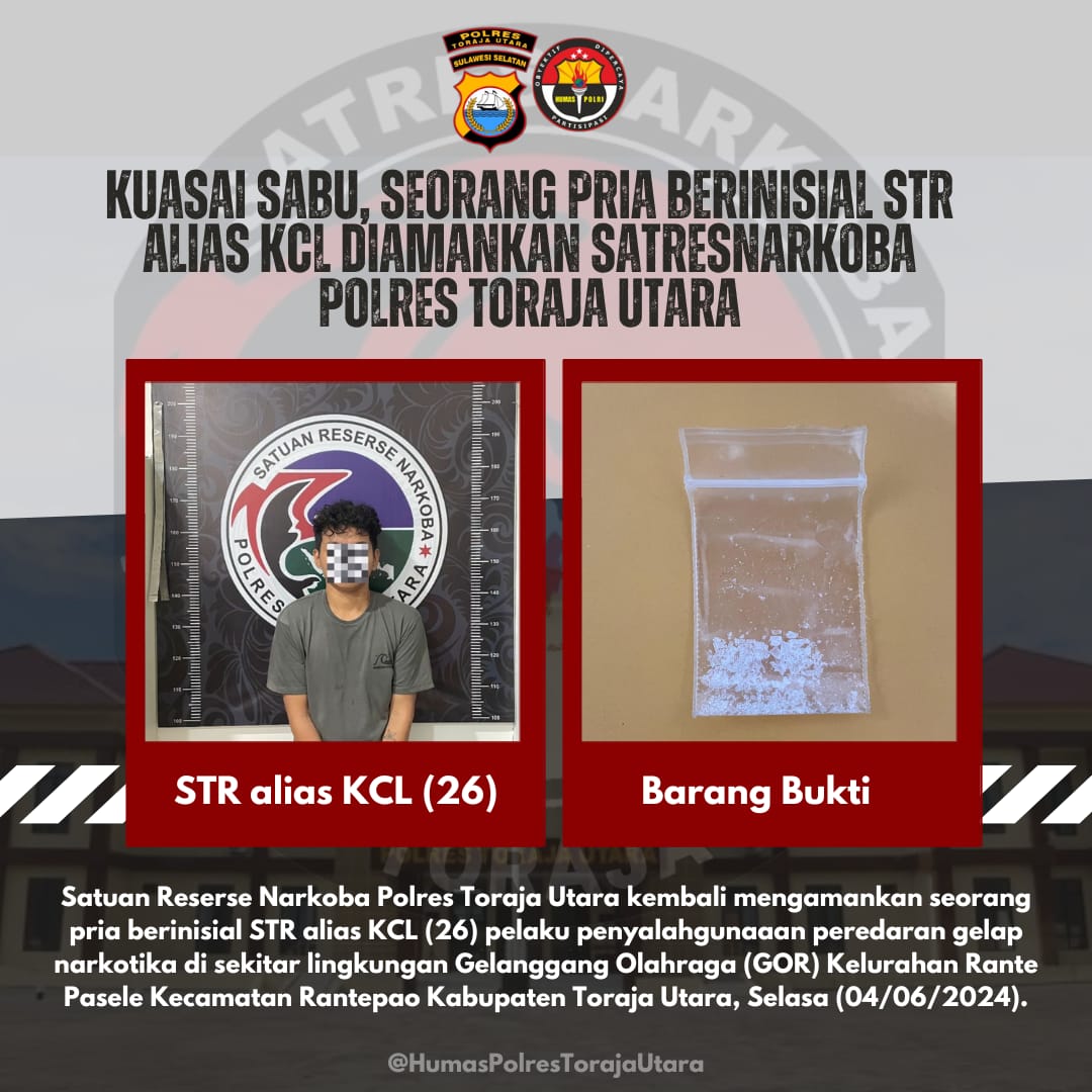 Saat dikonfirmasi, Kapolres Toraja Utara AKBP Zulanda, S.IK.,M.Si melalui Kasatresnarkoba AKP Syahrul Rajabia, S.T.,M.H pada Senin (10/06), membenarkan hal tersebut, bahwa pihaknya telah berhasil mengamankan seorang pria berinisal STR alias KCL (26) pelaku penyalahgunaan Peredaran gelap Narkotika.
