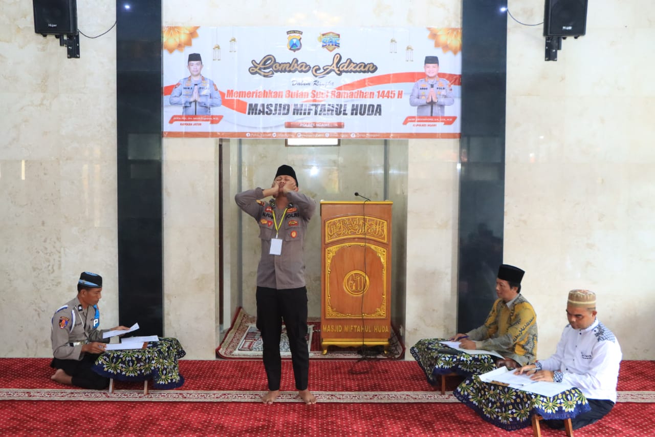 Ternyata Polres Ngawi mengadakan lomba adzan dalam rangka memeriahkan bulan suci Ramadhan 1445 H yang diikuti anggota dari perwakilan Bagian, Satuan fungsi, Seksi dan Polsek jajaran Polres Ngawi serta siswa SD/MI se-Kabupaten Ngawi.