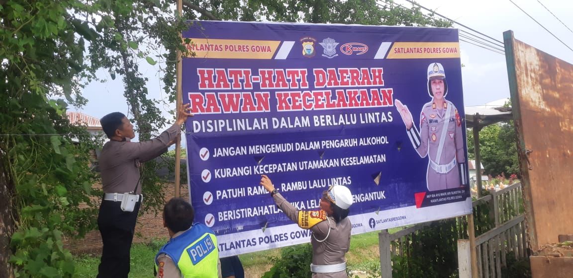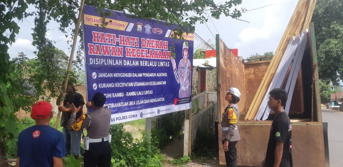 Berbagai upaya terus dilakukan jajaran Sat Lantas Polres Gowa untuk meminimalisir terjadinya kecelakaan lalu lintas di wilayah Kabupaten Gowa, salah satu diantaranya yakni dengan menggelar pemasangan spanduk di beberapa titik ruas jalan raya.