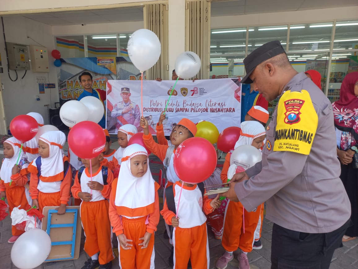 Sebagaimana dikatakan oleh Kapolres Ngawi AKBP Argowiyono, S.H., S.I.K., M.Si., melalui Plt Kasi Humas Iptu Dian, “Dalam rangka Bakti sosial Polri peduli dengan membagikan buku bacaan.”