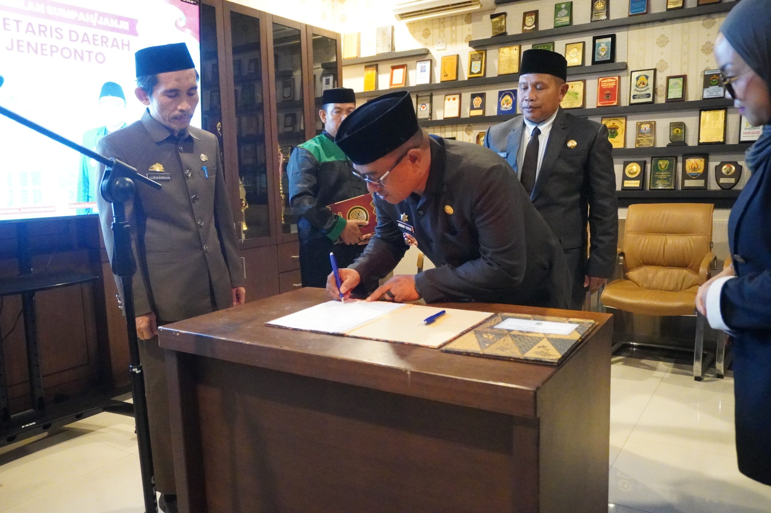 Acara diawali dengan pembacaan Surat Keputusan Bupati Jeneponto oleh Muh. Yusuf, S.Sos., M.M., yang menetapkan Maskur, S.Ag., M.H., CGCAE sebagai Penjabat Sekretaris Daerah Kabupaten Jeneponto. Prosesi dilanjutkan dengan pengucapan sumpah jabatan, penandatanganan naskah sumpah, serta berita acara pelantikan oleh Bupati dan pejabat yang dilantik.