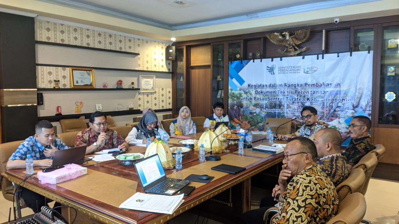 Rapat tersebut melibatkan perwakilan dari Kementerian Perdagangan serta Kementerian Pekerjaan Umum dan Perumahan Rakyat (PUPR) sebagai mitra strategis yang berperan dalam sinkronisasi teknis, regulasi, dan dukungan pemerintah pusat. Hadir pula Kepala Bappeda Jeneponto, Dr. H. Alfian Afandy Syam, S.T., M.T., Ph.D, bersama perangkat daerah terkait.