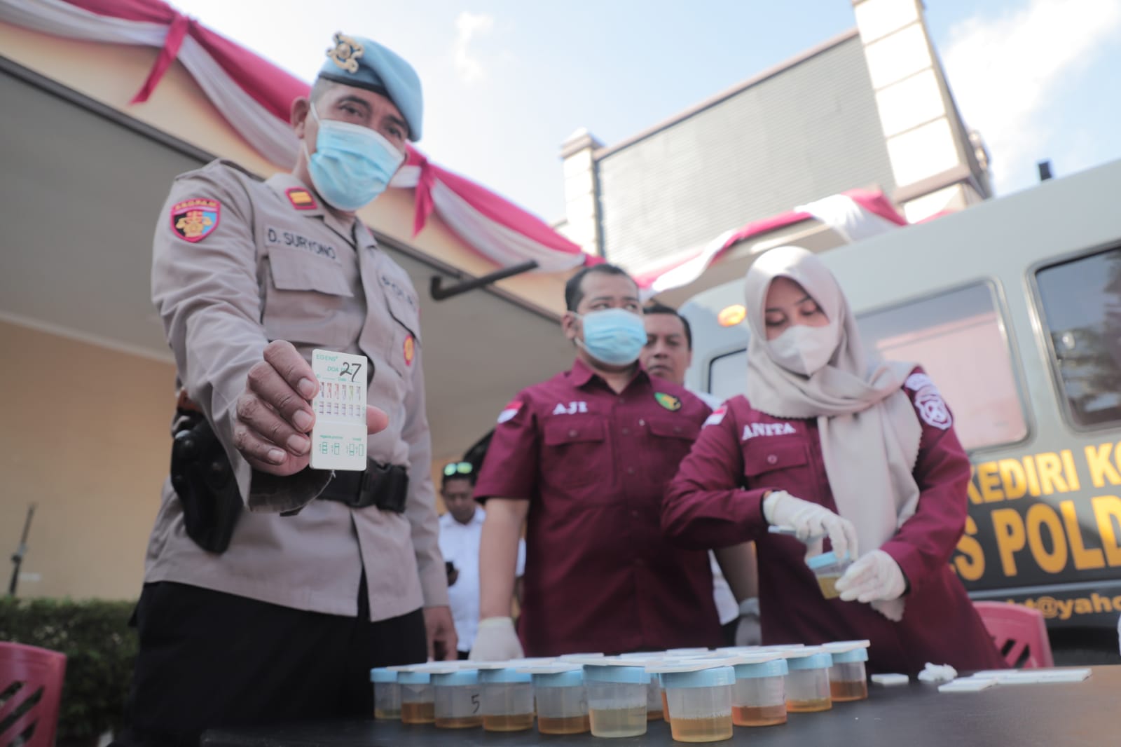 “Kapolres Kediri Kota AKBP Teddy Chandra, S.I.K., M. Si. melalui Wakapolres Kompol Doddy Pratama, S.I.K. mengatakan hari ini sengaja kami lakukan tes urine mendadak kepada anggota Sat Reskrim dan Sat Resnarkoba Polresta Kediri Kota setelah pelaksanaan Apel pagi” jelasnya.