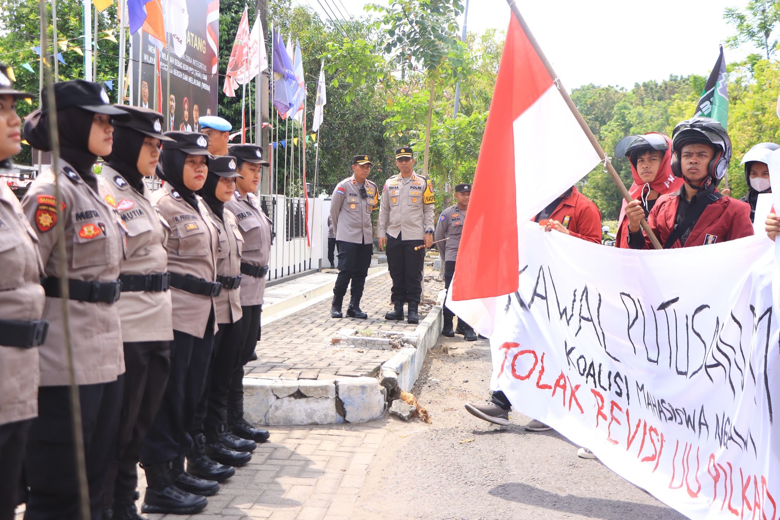 NGAWI, Pilarbangsa.co.id. Polres Ngawi Polda Jatim mengawal aksi damai yang dilakukan oleh Koalisi Mahasiswa Ngawi di kantor DPRD dan KPUD Kab. Ngawi, Jumat (23/8/2024)