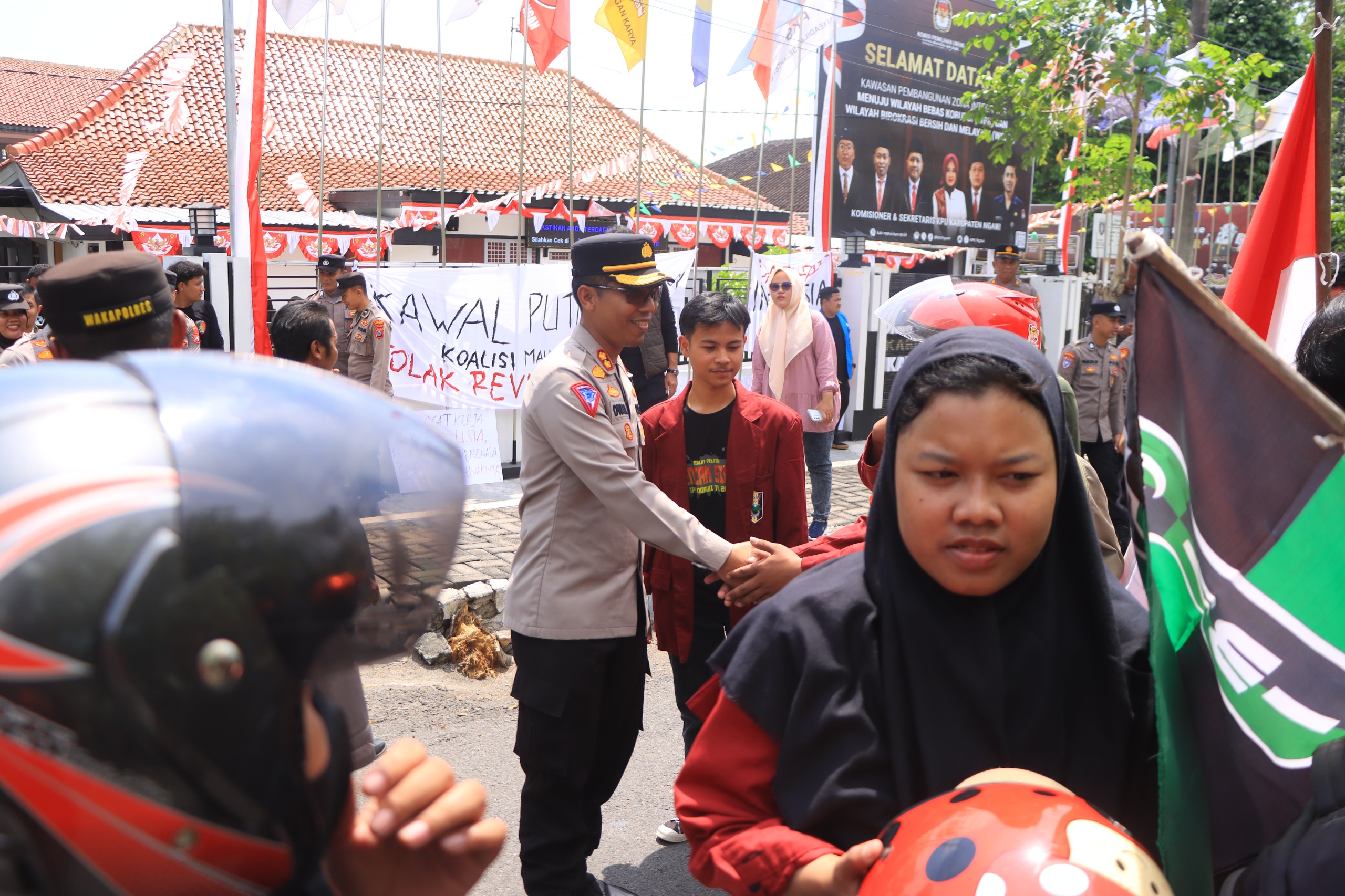 NGAWI, Pilarbangsa.co.id. Polres Ngawi Polda Jatim mengawal aksi damai yang dilakukan oleh Koalisi Mahasiswa Ngawi di kantor DPRD dan KPUD Kab. Ngawi, Jumat (23/8/2024)