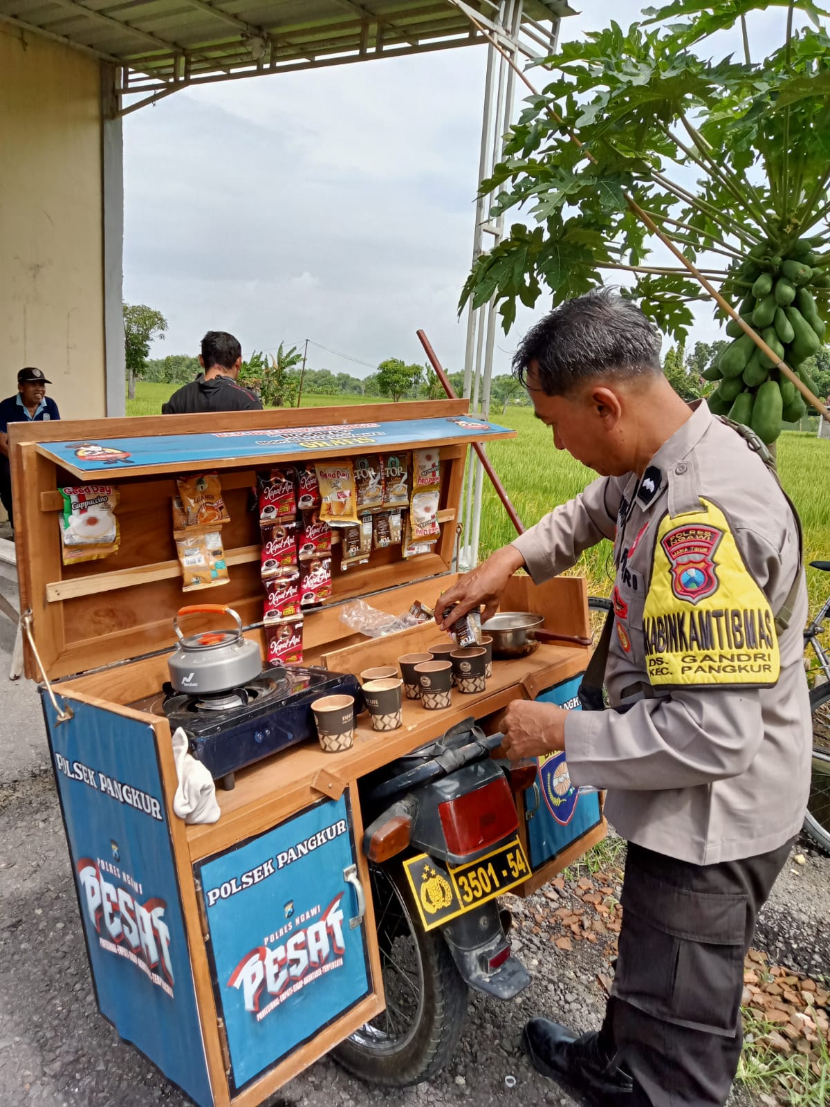 Kegiatan tersebut berlangsung di Desa Gandri, Kecamatan Pangkur, Kabupaten Ngawi. Dalam suasana santai dan penuh keakraban, Bhabinkamtibmas menyampaikan pesan-pesan kamtibmas kepada warga agar senantiasa menjaga keamanan dan ketertiban lingkungan, meningkatkan kepedulian sosial, serta memperkuat kerukunan antarwarga.