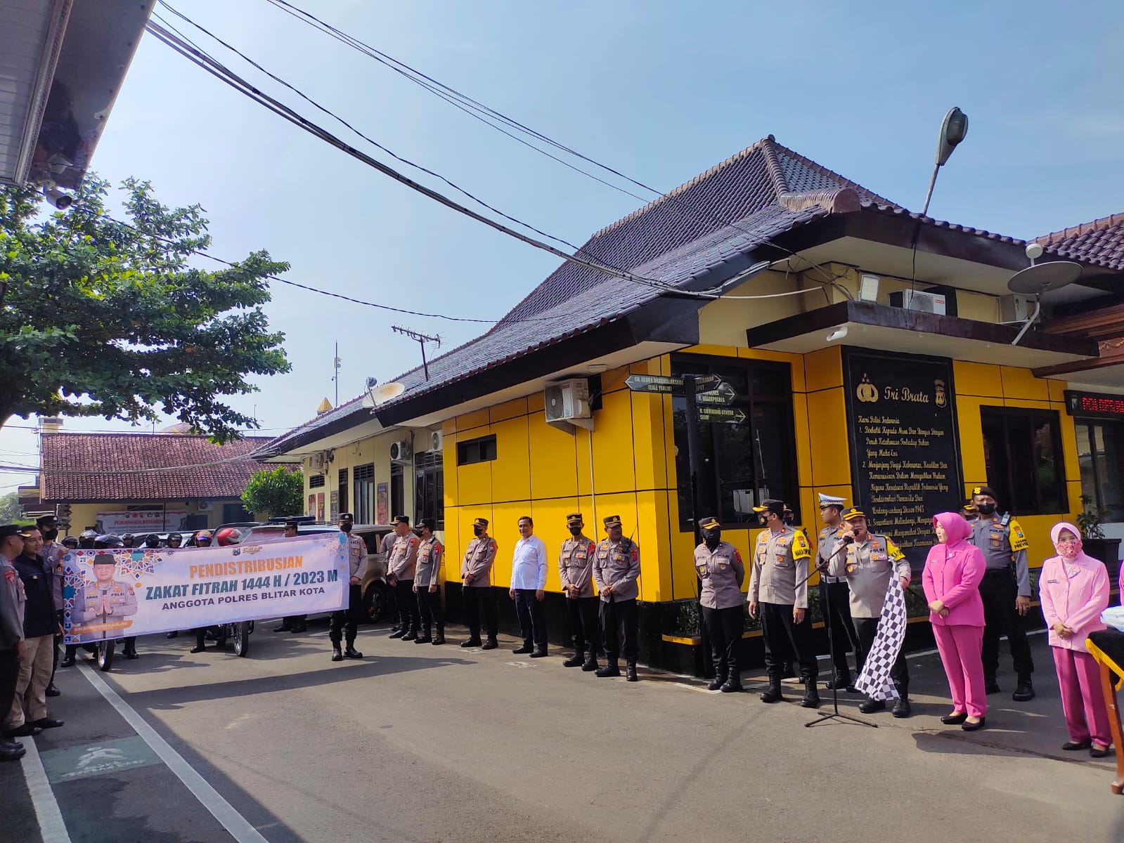 Kota blitar PB – Jelang hari raya Idul Fitri 1444 H/2023 M, Polres Blitar Kota menyalurkan zakat fitrah sebanyak 1.527 kilogram beras. Penyaluran zakat tersebut berlangsung di halaman depan Mapolres Blitar Kota, Selasa (18/4/2023).