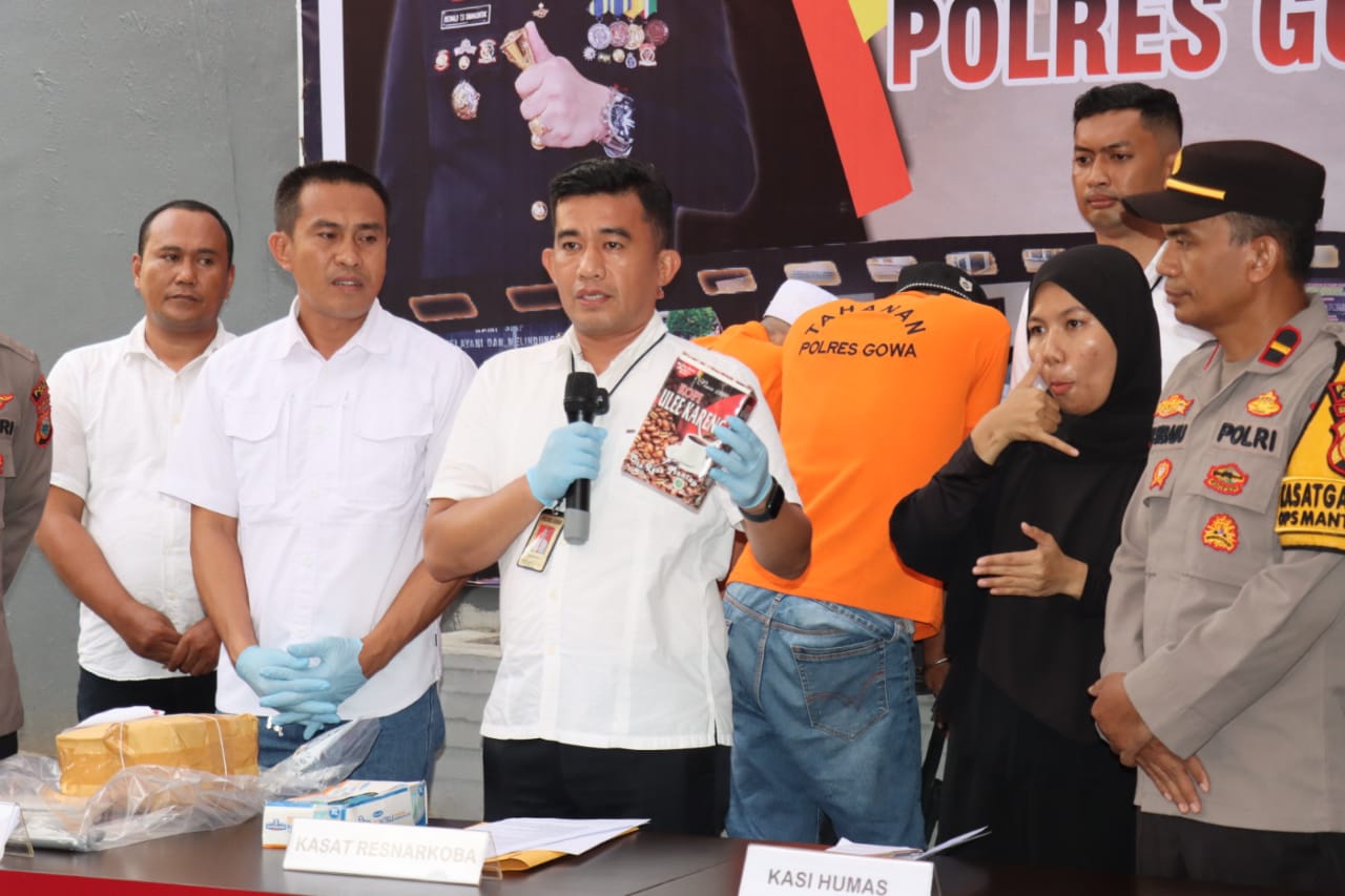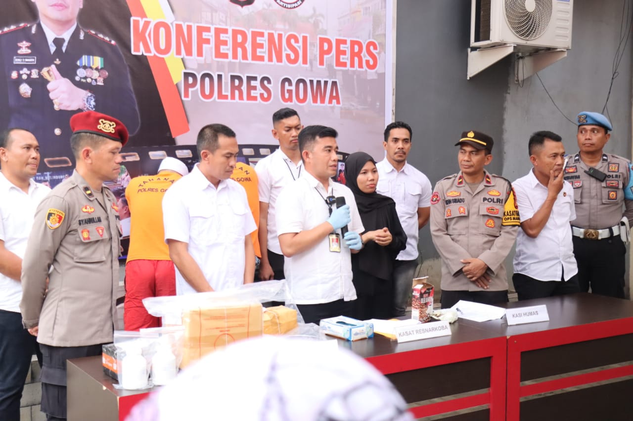 Kasat Narkoba Polres Gowa Iptu Syarifuddin, S.H., M.H didampingi Plt Kasi Humas Polres Gowa IPDA Udin Sibadu saat menggelar Press Release kasus tersebut menjelaskan, bahwa telah dilakukan penangkapan terhadap pelaku berinisial AS dan FR di dua lokasi berbeda setelah personel kami melakukan penyelidikan serta mendapatan informasi.