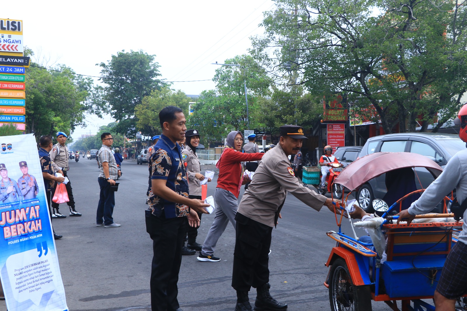 Polres Ngawi Polda Jatim menyediakan dan membagikan ratusan makanan gratis kepada masyarakat berupa nasi bungkus. Hal ini dilakukan rutin setiap hari Jumat pagi sebagai inovasi Polres Ngawi berupa “Jumat berkah”